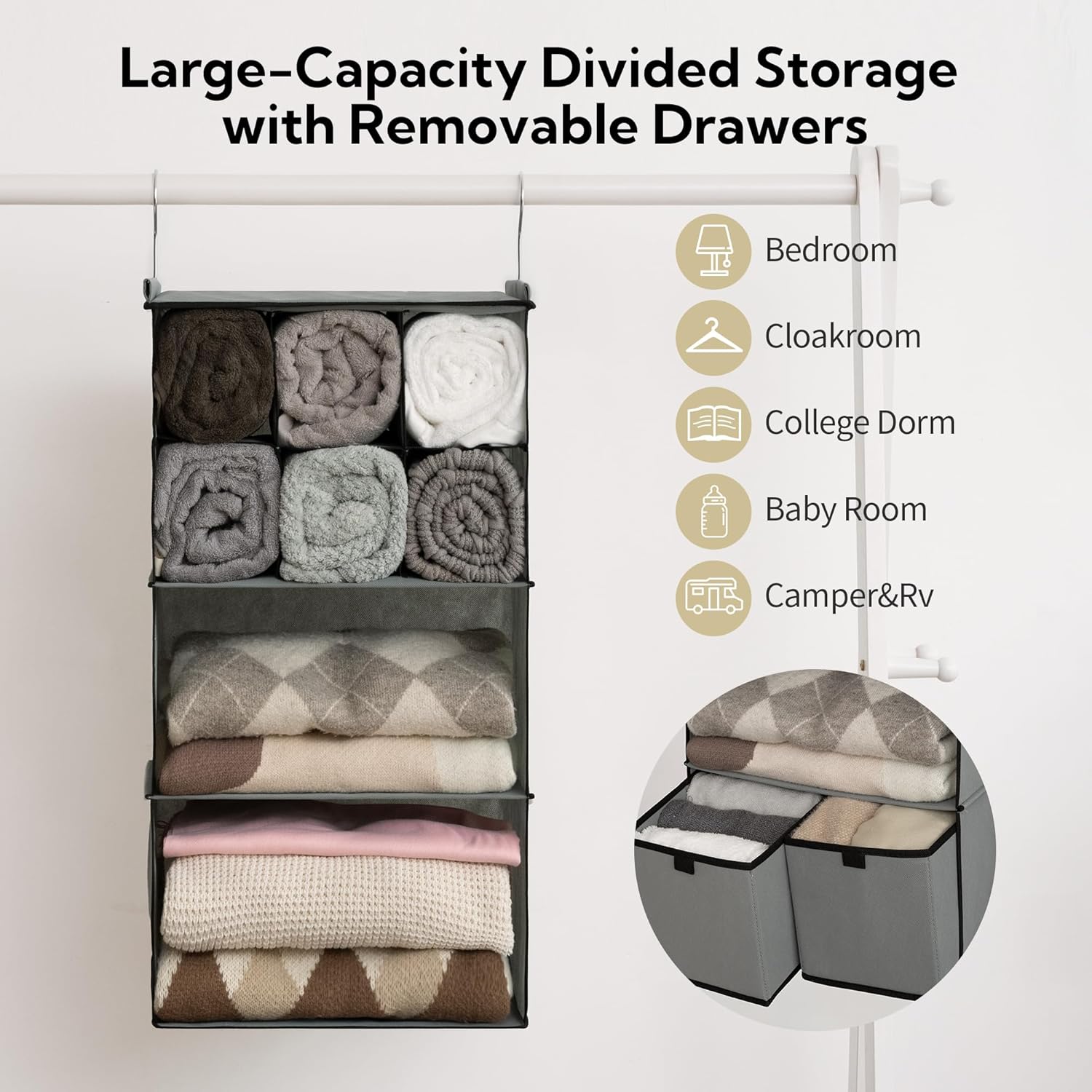 - Easy to Assembly: Very easy to use as a vertical closet storage organizer. Simply unfold the organizer and hang it in the closet using the 2 reinforced metal hooks included in the packaging. Then insert the drawers into any shelf you like and you're done!