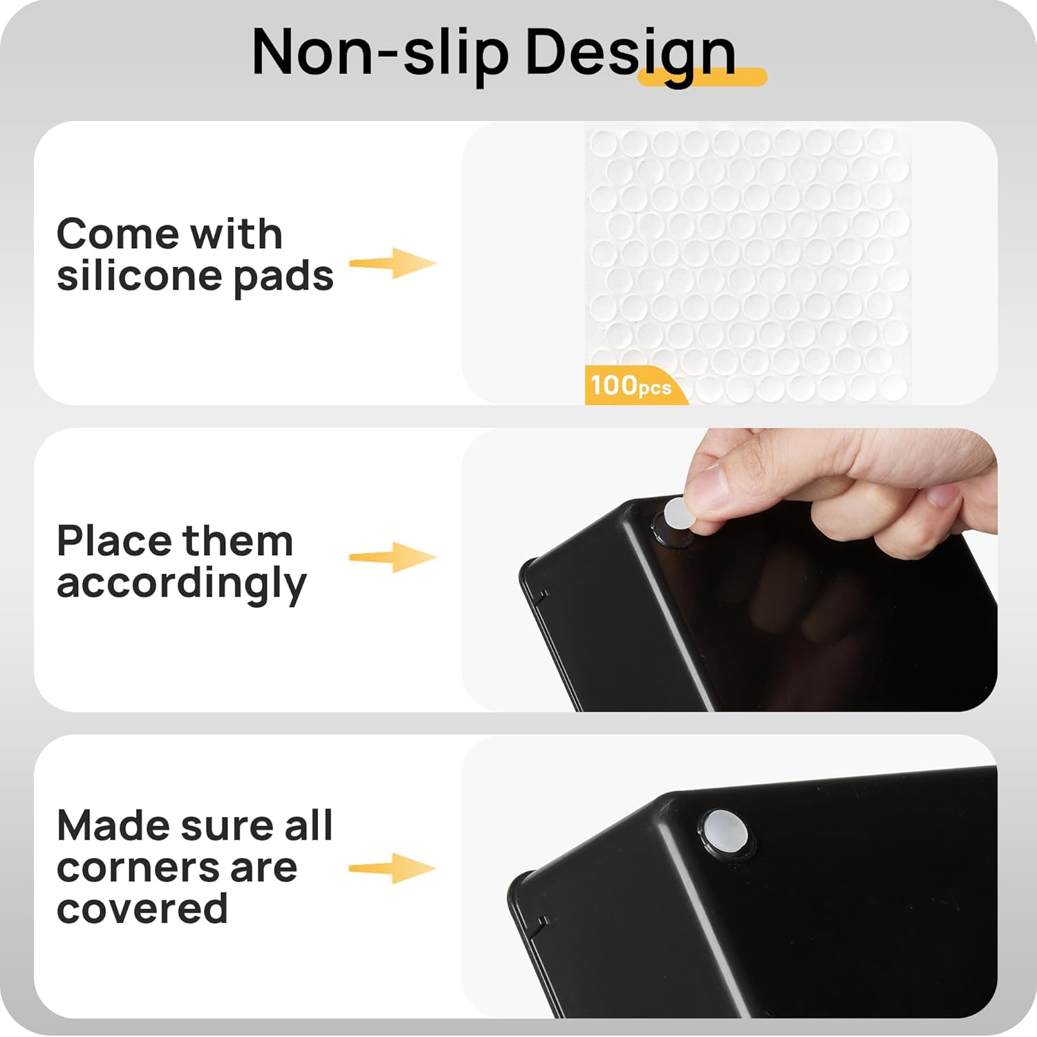 - 【Non-Slip and Durable】Extra 200pcs silicone pads are included, just stick them on the bottom of the plastic trays for non-slip. Made of durable and clear plastic, so you can see what’s in it without digging around or making a mess, help you get a neat lifestyle.