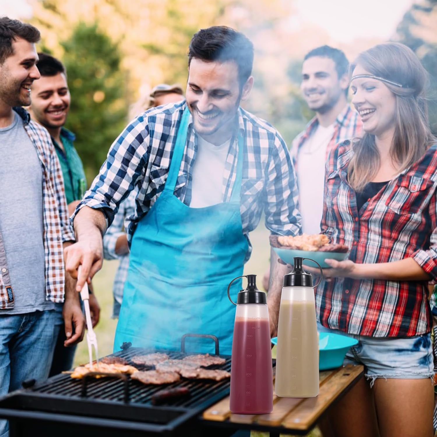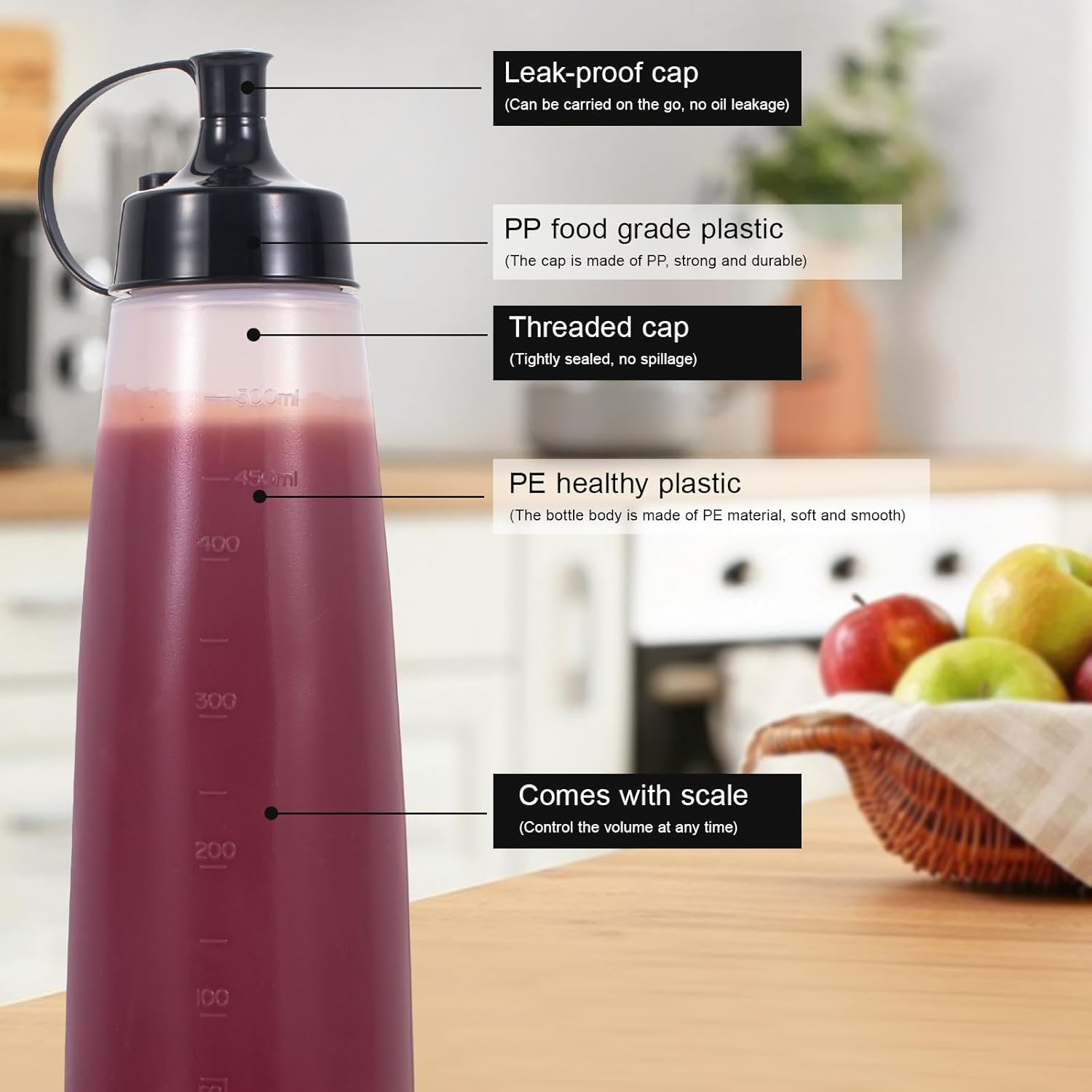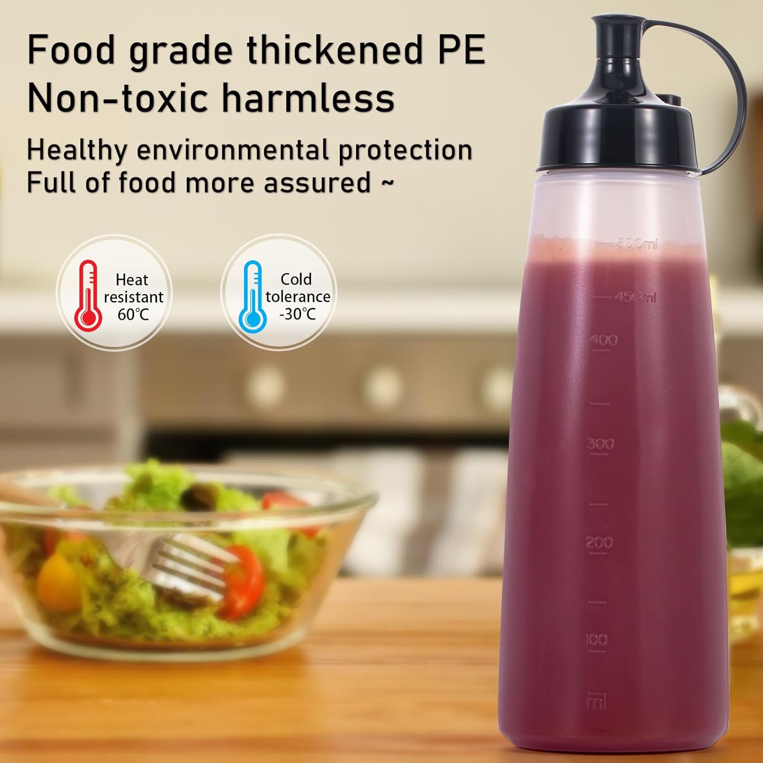 • Direct Measurements - Condiment squeeze bottle has a standard 100ml - 500ml scale line. By translucence plastic condiment squeeze bottles, you can squeeze precisely and see the capacity.