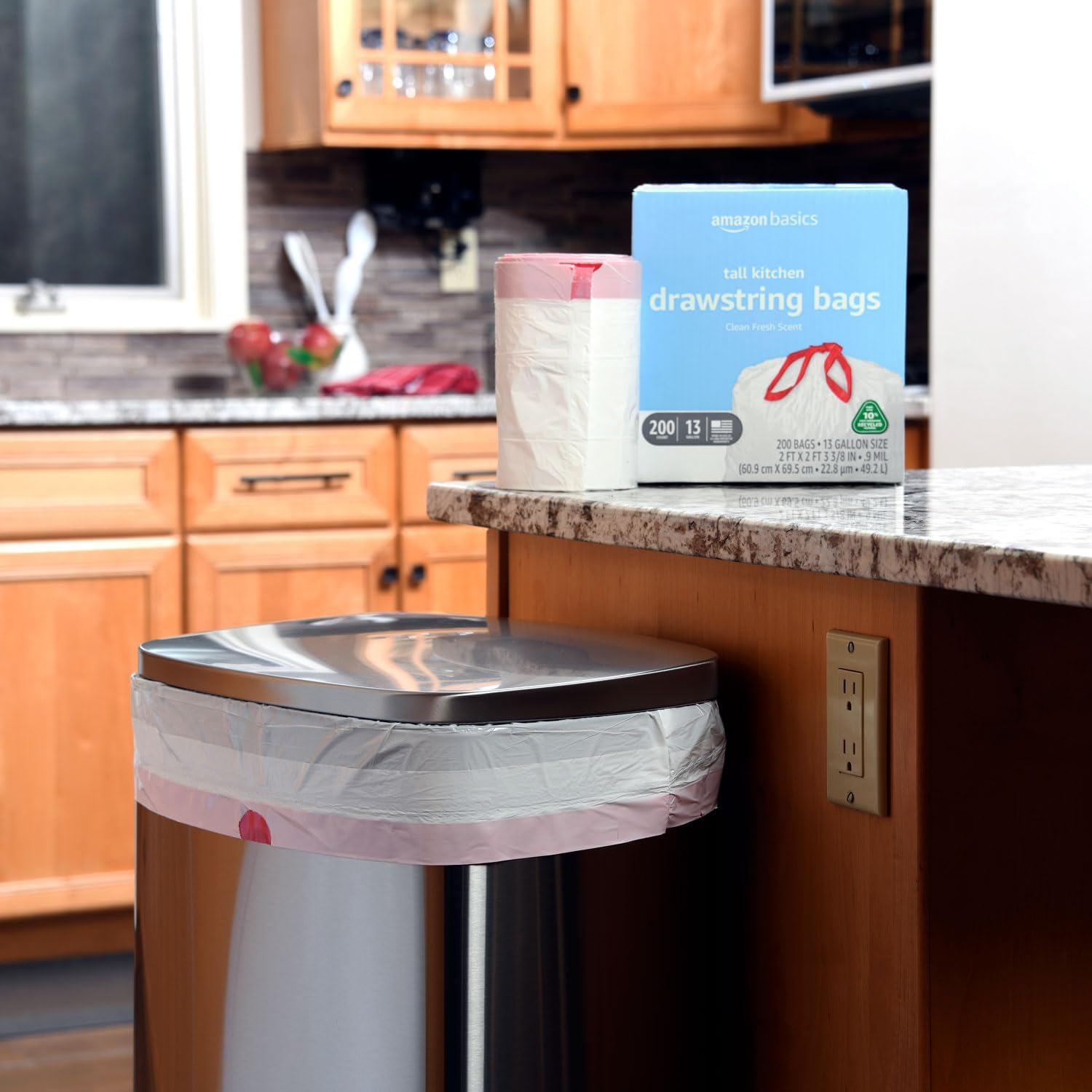 Amazon Basics 13 Gallon Tall Kitchen Drawstring Trash Bags, Clean Fresh Scnet, 10% Post Consumer Recycled, 200 Count