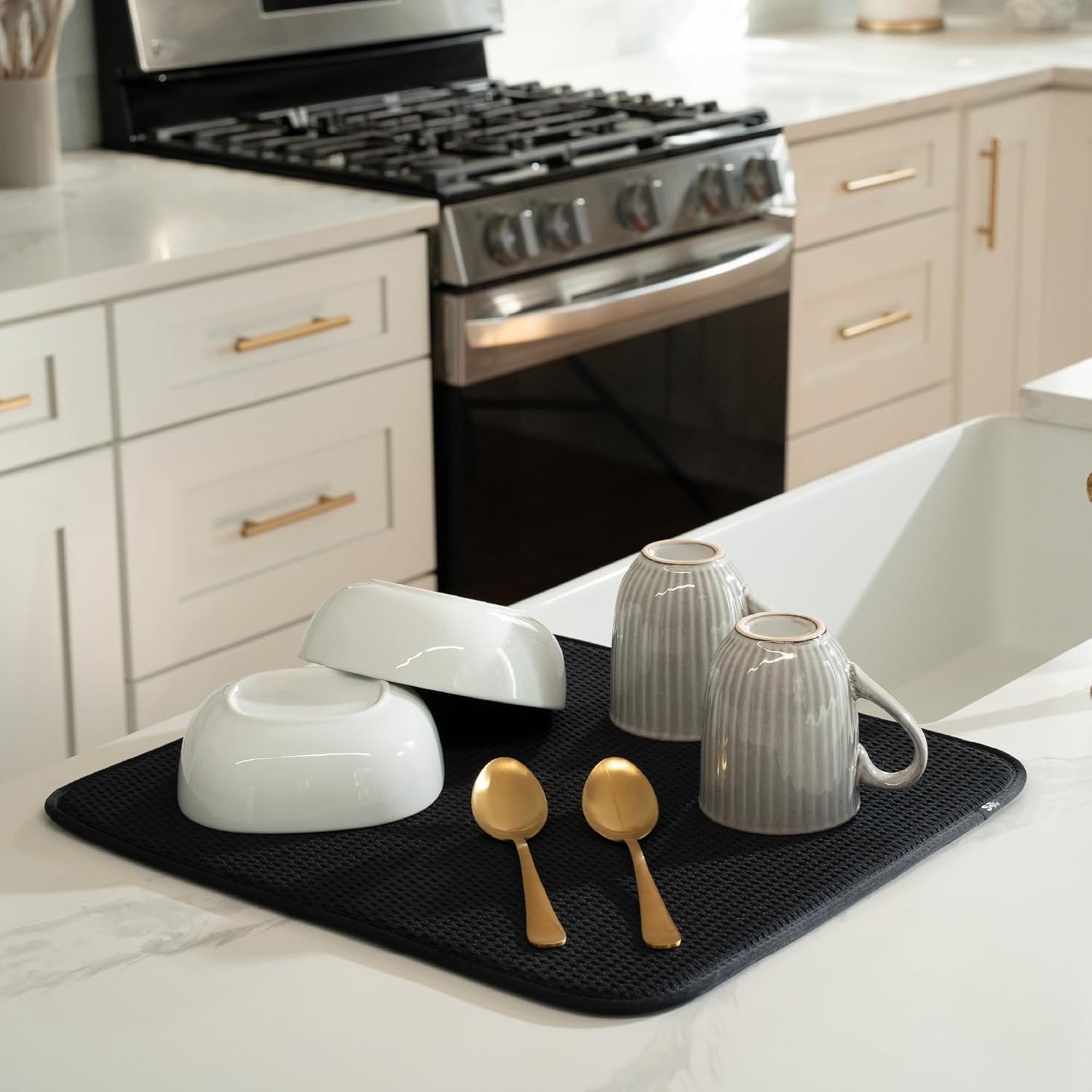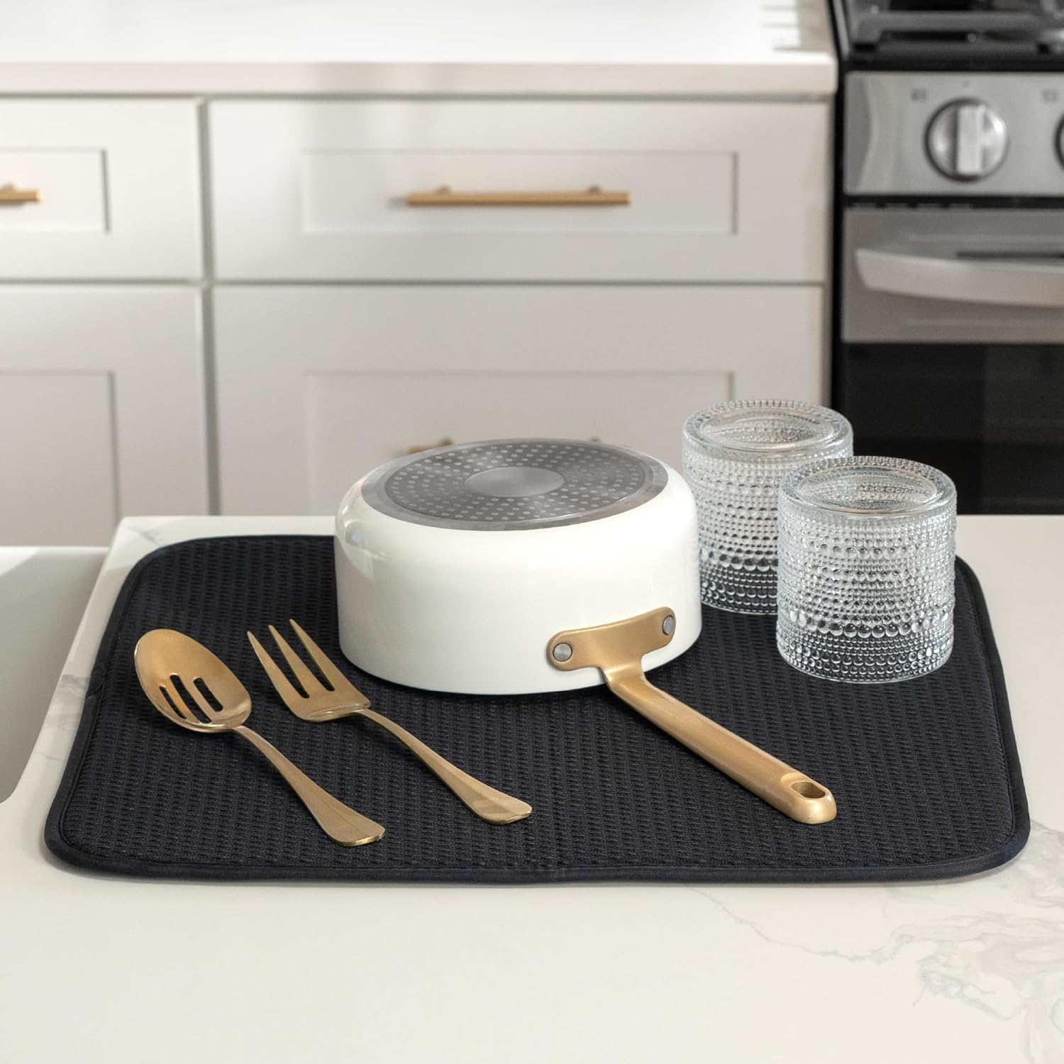 • Dish drying mats for kitchen counter are reusable, machine washable, and easy to store for kitchen organization; durable construction will not chip or break like a stone dish drying mat for kitchen