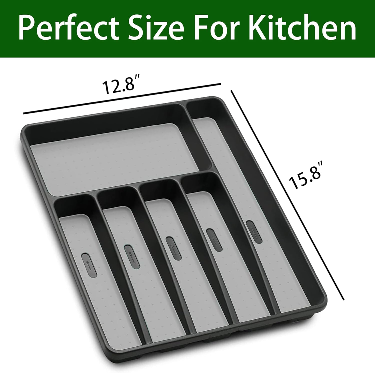 - ✅【Perfect size for any drawer】Measuring at 15.8’’L x 12.8”W x 1.8”H, our utensil organizer fits both standard and small-sized drawers. Its depth allows you to store multiple utensils in a single compartment without worrying about them getting tangled. Plus, the non-slip design ensures your cutlery stays secure during drawer use.