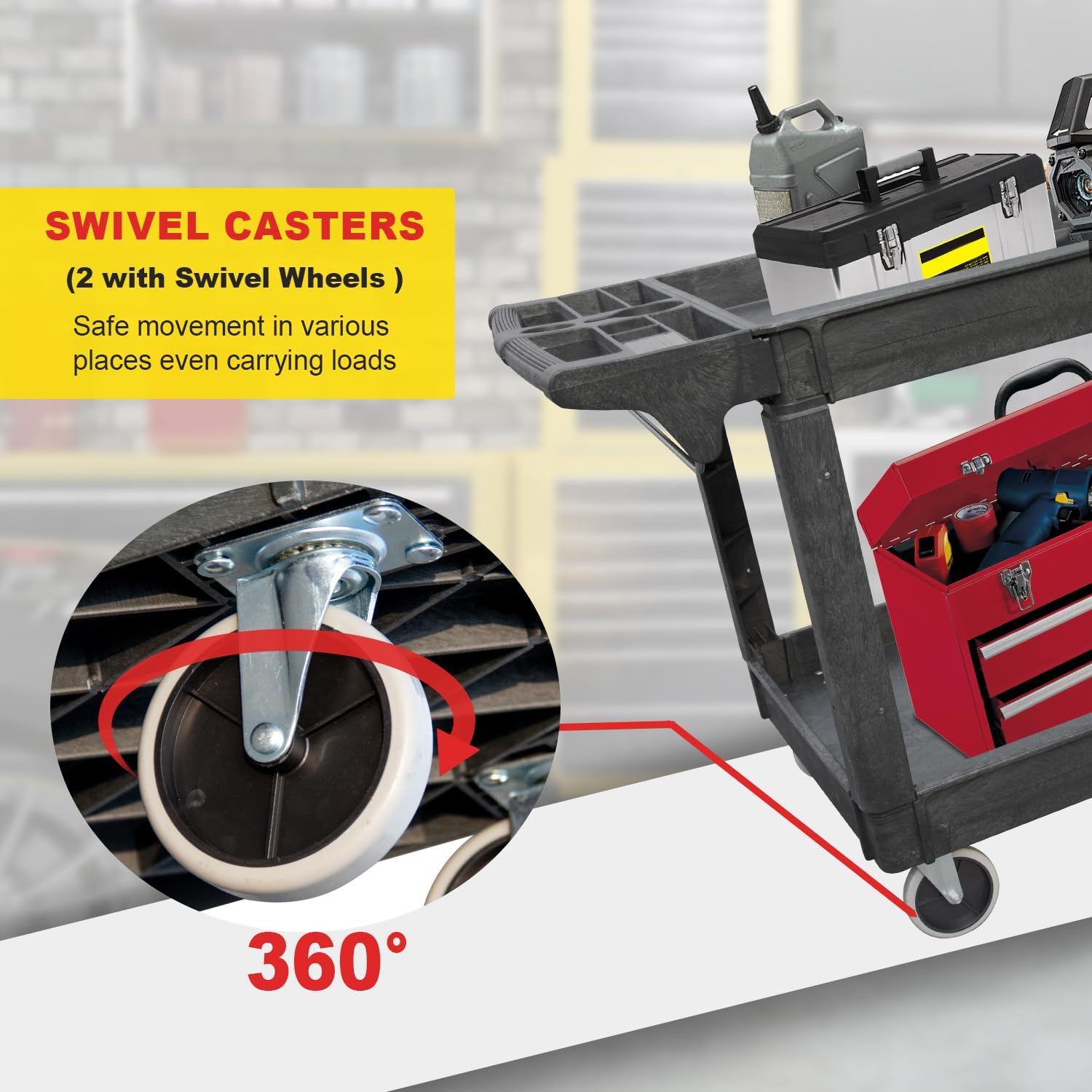 Utility Service Cart, 2-Shelf 500LBS Heavy Duty Plastic Rolling Utility Cart with 360° Swivel Wheels, Lipped Shelves, Ergonomic Storage Handle for Warehouse/Garage/Cleaning/Manufacturing