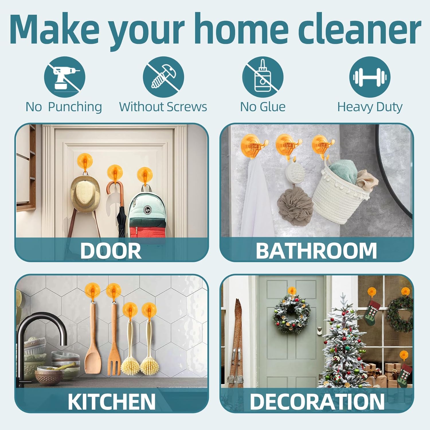 - 【Clear Hard Plastic】The Clear Suction Cup Hooks is made of premium plastic, no rust, no deformation, can perfectly organize your shower wall. Unlike Other brand in the market our suction cup hook is anti-hot-water max 158°F so your don't worry about falling off when shower hot water. Your can use it to hanging loofa, bath sponge, towel, robe, brush, clothes and more. Also suitable for outdoor glass windows Christmas wreath hanger