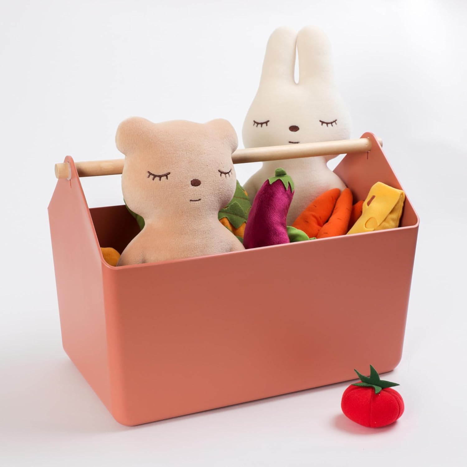 BLUE GINKGO Large Storage Basket – Plastic Caddy with Wooden Handle for Bathroom, Pantry, or Cleaning Supplies (Terracotta)