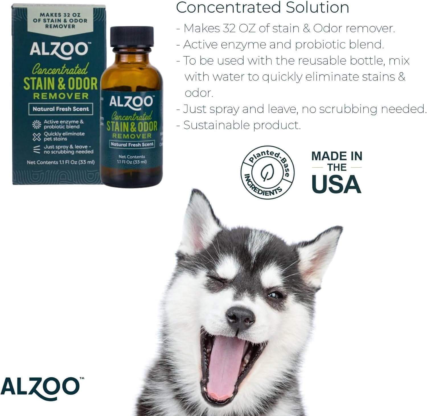 ALZOO Concentrated Stain & Odor Remover Refill Bottle, 100% Plant-Based Active Ingredients, 1.1 Fl. Oz, Pack of 3