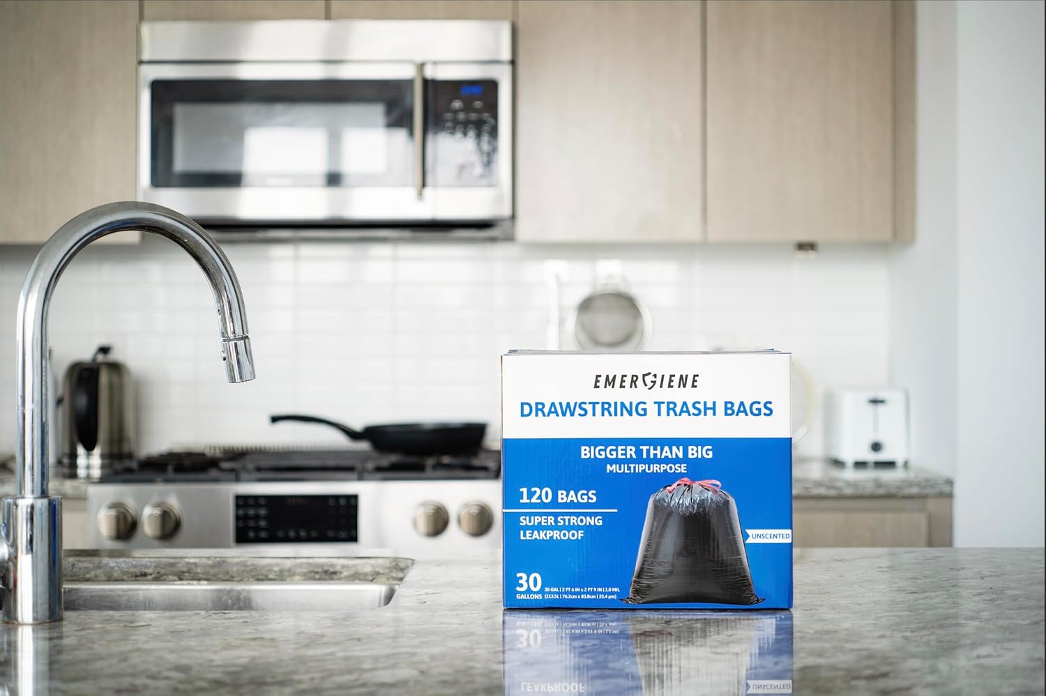 Ultra Strong 30 Gallon Drawstring Trash Bags, Unscented 120 Count Garbage Bags, Pre-Separated, Recycled Materials, Heavy Duty, Leakproof, Sturdy, Black