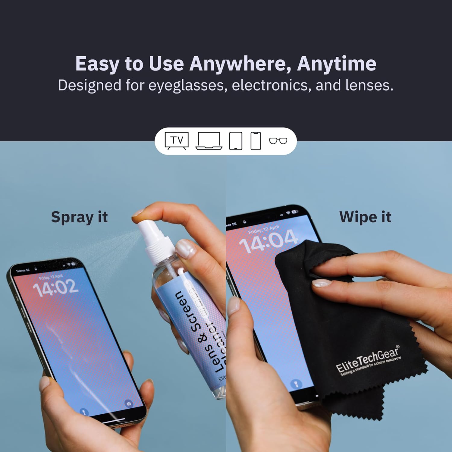 Elite Tech Gear Optical, Screen & Lens Care Kit - 3pc Spray (2x4oz+1oz) with 2 Microfiber Cloths - Alcohol-Free Eyewear Solution - 5pc Glasses Cleaner