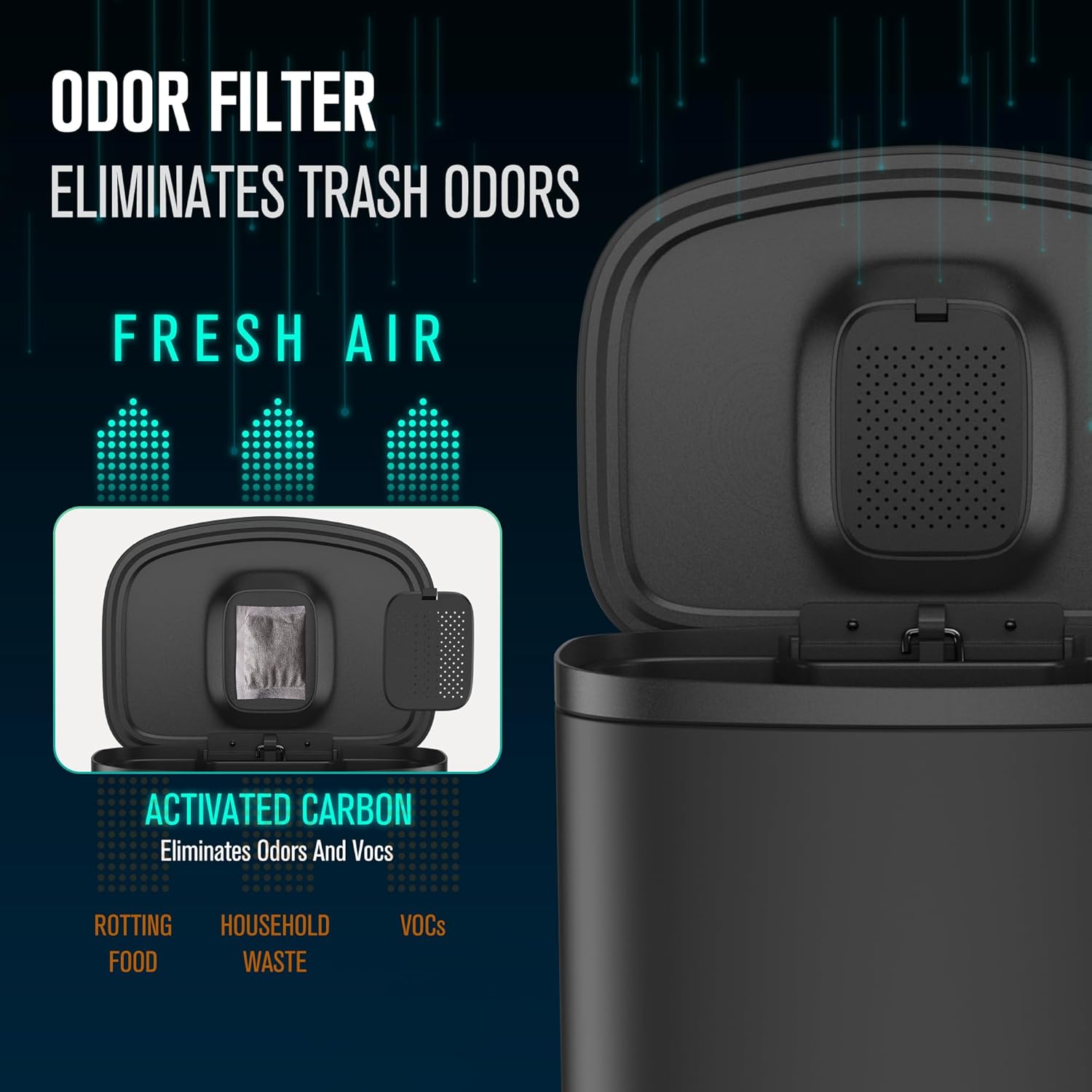 - Durable and Easy to Maintain: Our trash can features a smudge-resistant, durable stainless steel exterior, ensuring it stays looking pristine for longer. The heavy-duty plastic interior bucket is easily removable for hassle-free waste disposal, while the stay-open lid lock facilitates effortless bag changes and cleaning.