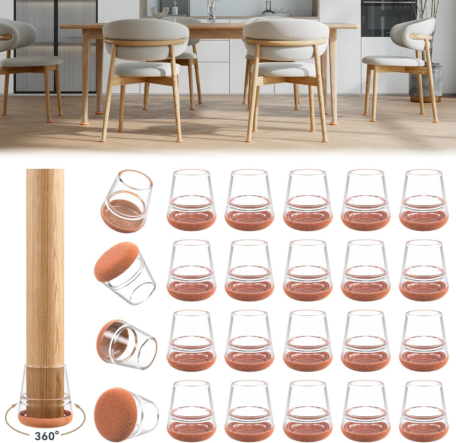 - ✅【Easy to Use】The chair leg covers to protect floors has high transparency, which greatly restore the original color of the table and chair legs, look more natural. The furniture leg cap is easy to install, without the use of tools. When the furniture chair socks are dirty, the chair stoppers can be cleaned and used repeatedly. Mainly suitable for smooth floors such as hardwood, tile, composite floor, and vinyl floor. Clear cap style match with most floors.