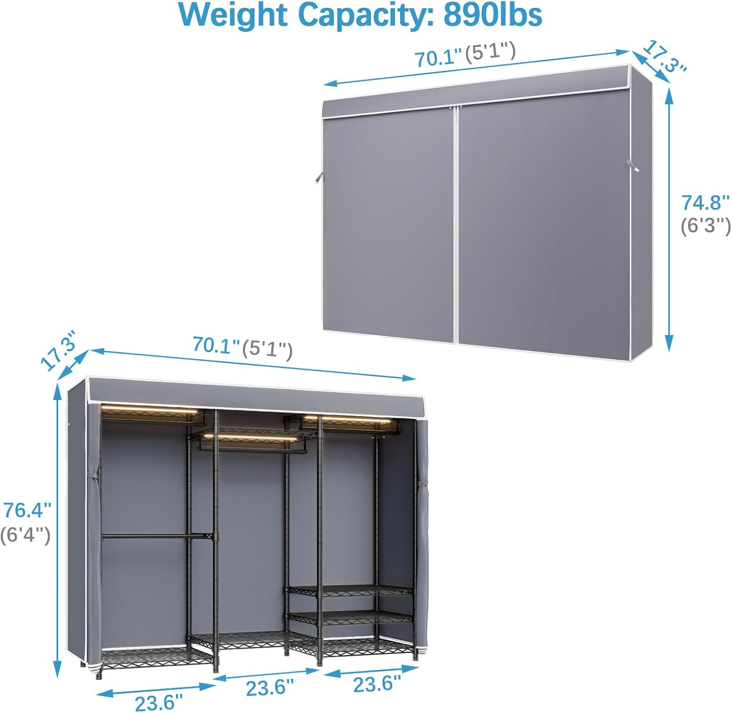 • Dimensions & Load Capacity: 70.1" L x 17.3" W x 76.4" H (includes cover). Load capacity up to 890 lbs. Single hanging rod can support up to 88 lbs, Wire shelf can support up to 90 lbs for each.