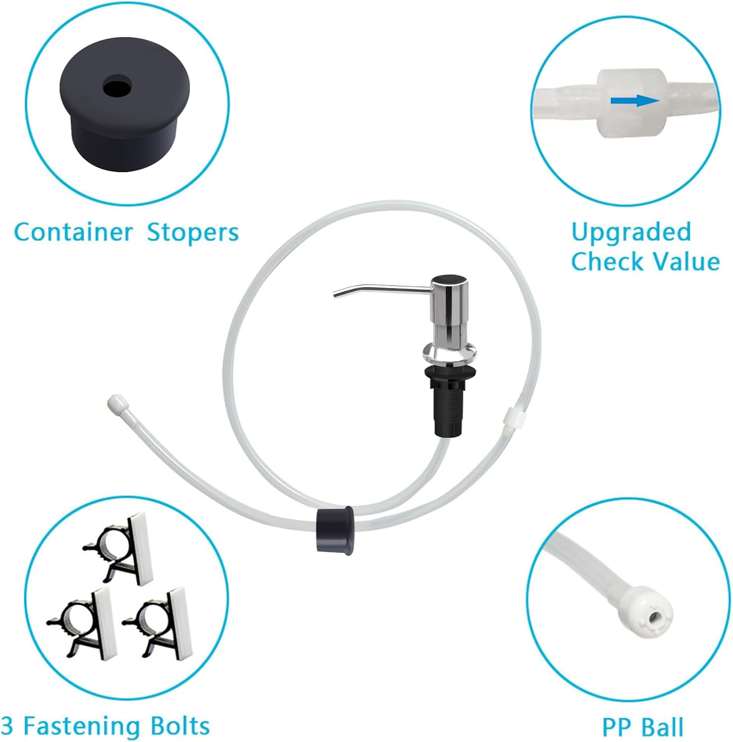 • PACKING INCLUDING -- 1 x soap dispenser pump head, 1 x 47" extension tube, 1 x soap bottle stopper, 1x check valve, 1x PP ball, 3x fastening bolts
