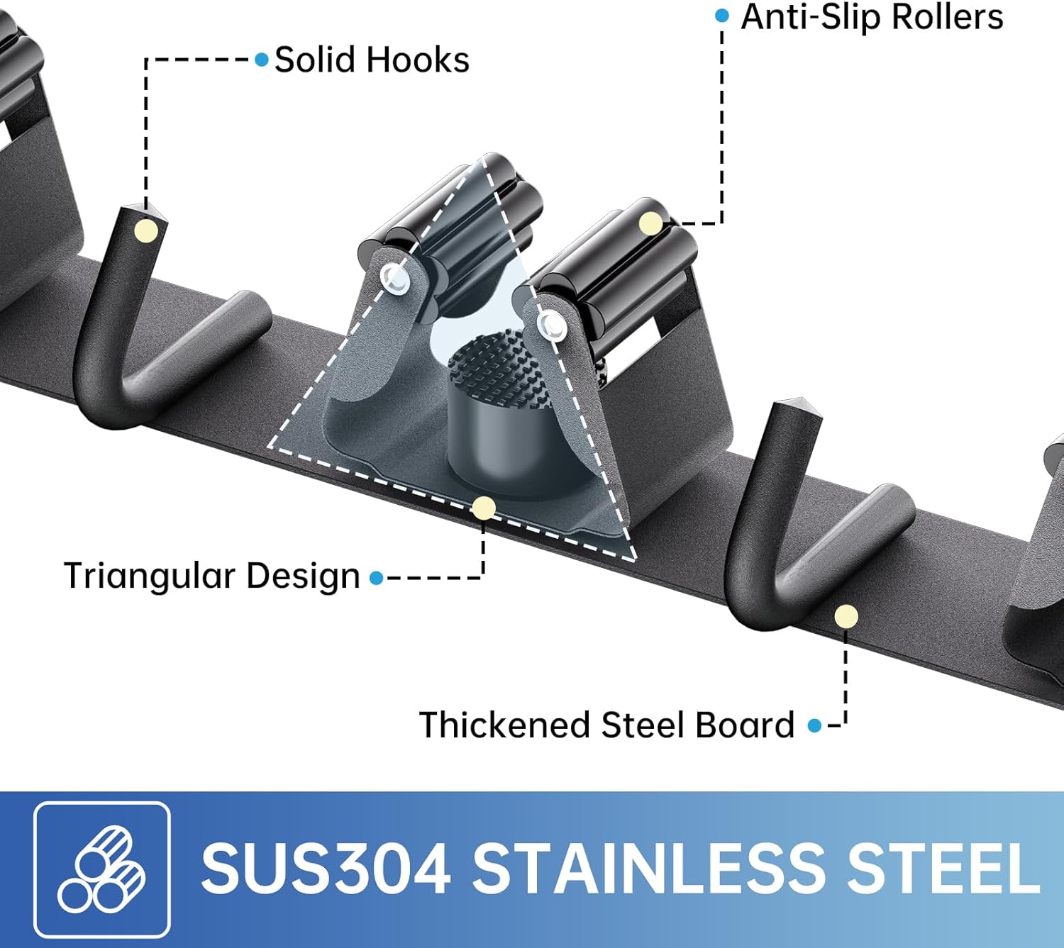 • 🏡【NON-SLIDE DESIGN】Each rack of the broom and mop holder wall mounted features an adjustable triangular design. The spring-loaded, double rubber gripped slots can keep a stronger hold on your items with diameter of 0.7 inch-1.3 inch. Whether wet mops or baseball bats, nothing slips.