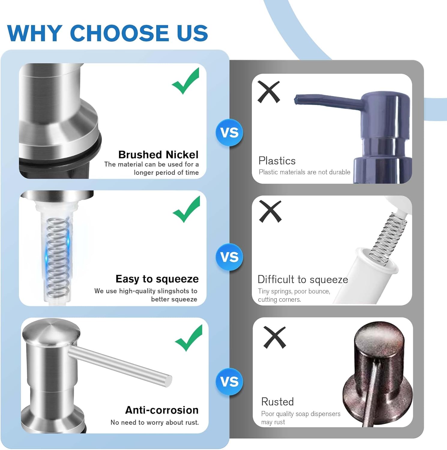 • Very Durable : Our kitchen sink soap dispenser is made of Brushed Nickel stainless steel on the outside, which has been treated with brushed nickel to prevent decay and rust; The under counter soap dispenser for kitchen sink is suitable for most countertops (granite, stainless steel, wood glass and others