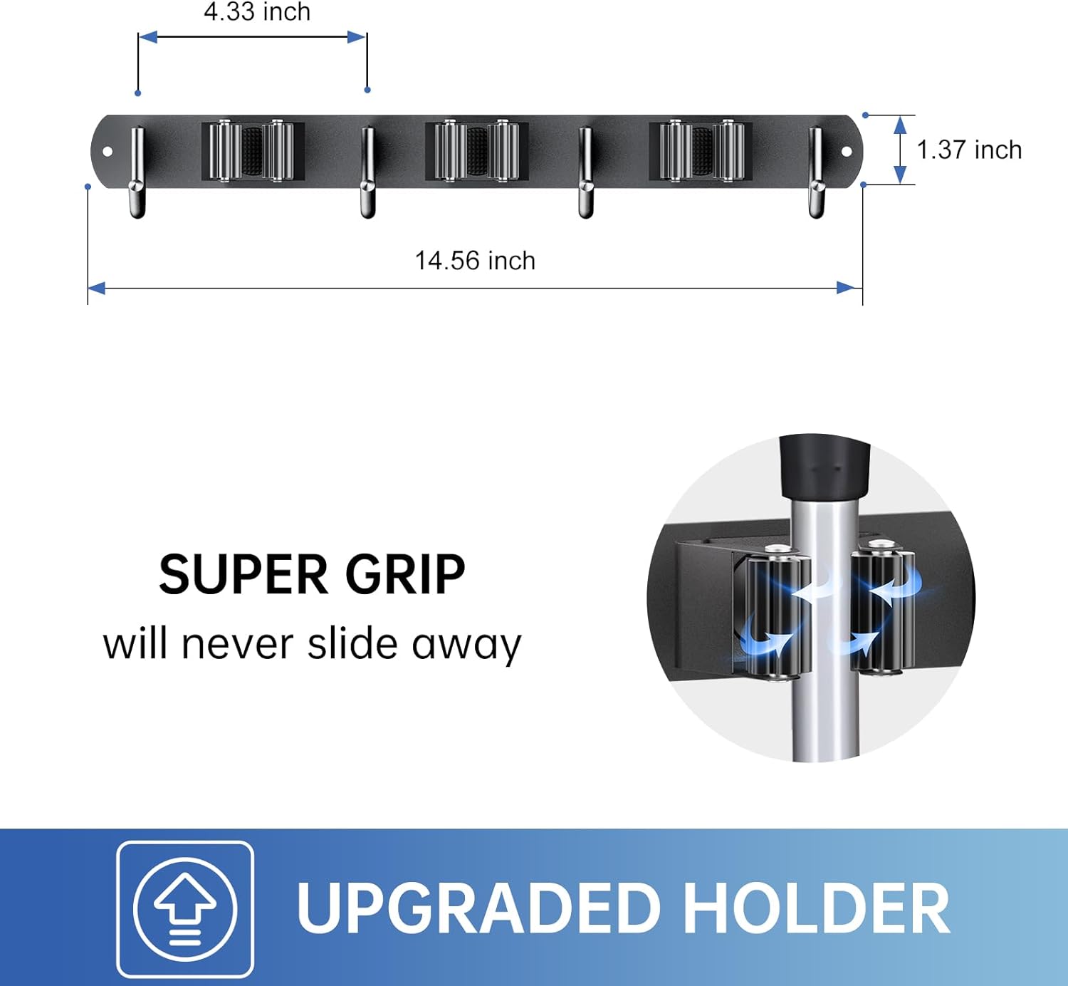 • 🏡【NON-SLIDE DESIGN】Each rack of the broom and mop holder wall mounted features an adjustable triangular design. The spring-loaded, double rubber gripped slots can keep a stronger hold on your items with diameter of 0.7 inch-1.3 inch. Whether wet mops or baseball bats, nothing slips.