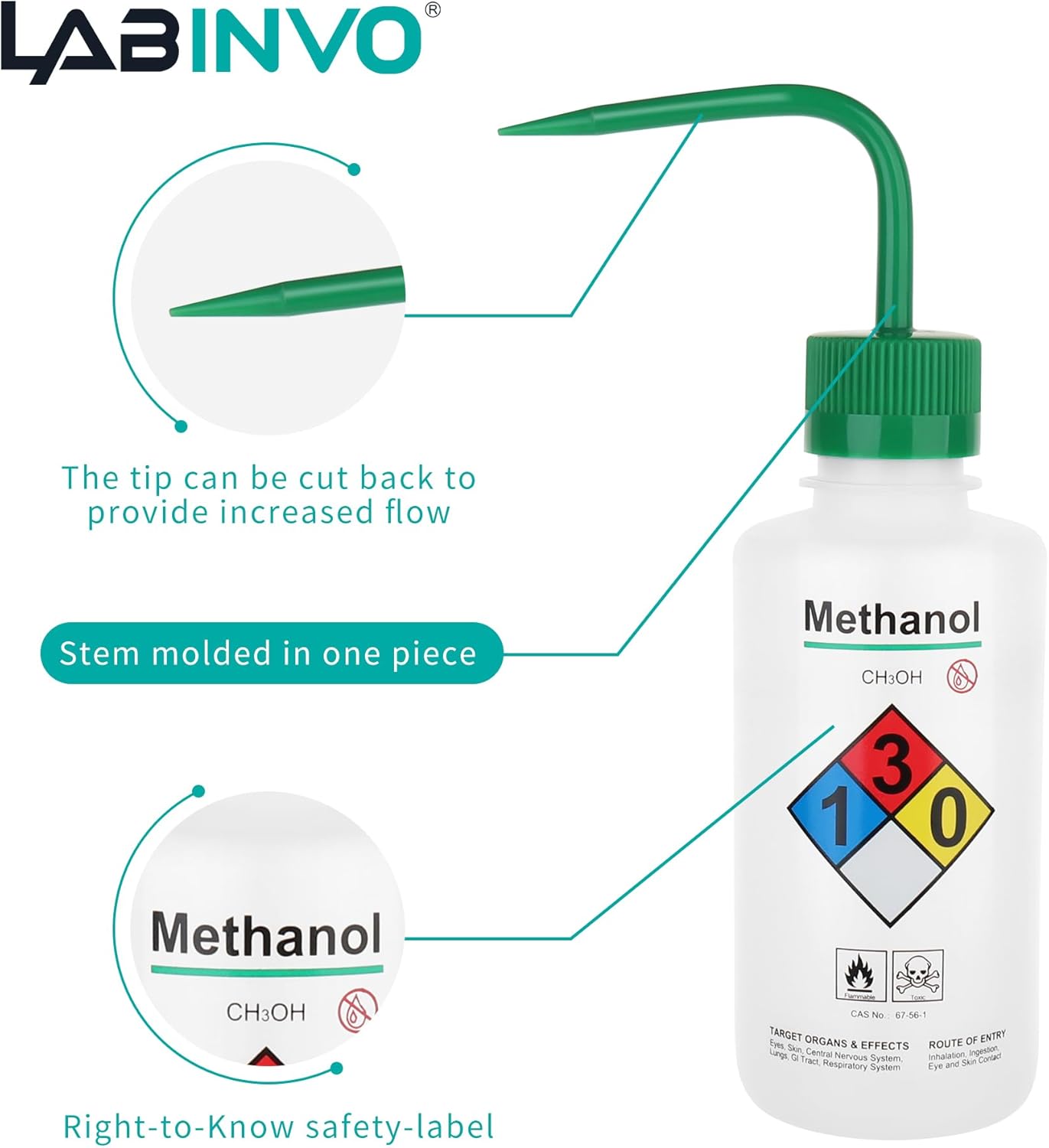 • Appearance: These wash bottles have a label with chemical name, the chemical formula of the International Chemical Society (ICS) and the Chemical Abstract Service (CAS) number.