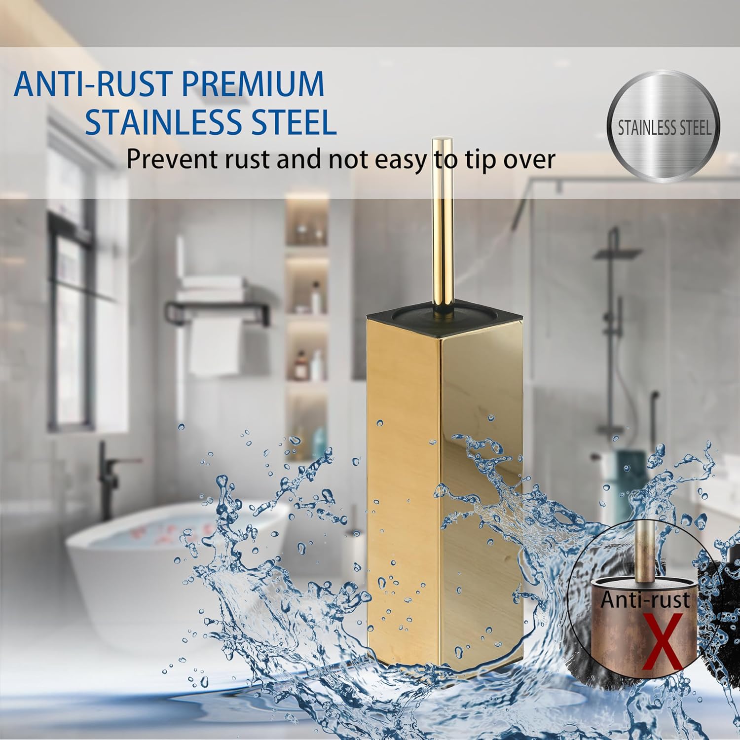 BGL Square Toilet Brush with Holder,Stainless Steel Rubber Painted Toilet Bowl Brush and Holder for Bathroom,2 Cleaner Brush Heads,Gold
