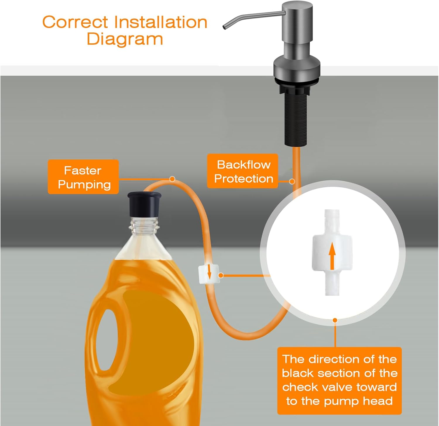 • Premium Quality & Durable: The kitchen sink soap dispenser is made of 304 stainless steel and premium quality PE plastic. Multi-layered brushed nickel finish makes it rust proof, so it has higher durability and reliability. Food-Grade silicone tube is soft and elastic, not easy to bend under the countertop, the check valve make the soap prime in the tube.