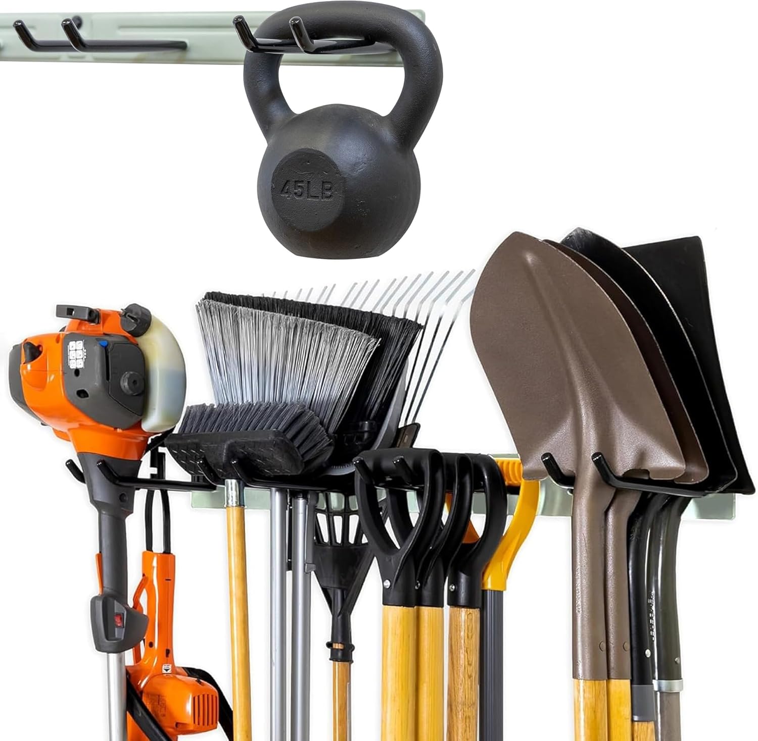 - ENGINEERED FOR PERFORMANCE – This tool organizer features an updated, reinforced backplate with structural bends to prevent sagging under weight. Built for wall-mounted storage in garages, garden sheds, or workspaces, its versatile design handles yard maintenance must-haves, power tools, and even acts as a broom holder wall mount.