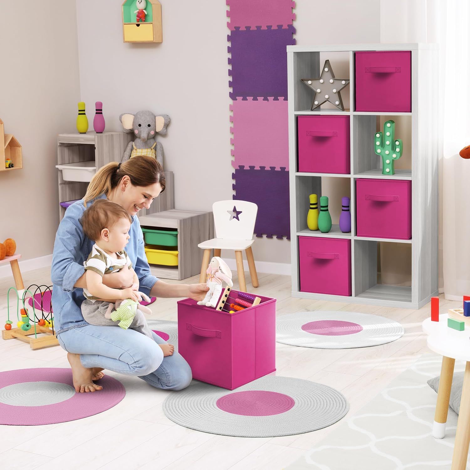 - Cubby Storage Bins Versatile Use: Use the Sorbus cube storage bins in the kid's room, toy storage, family room, laundry area, closet, storage room, etc - Sit Cube Organizer Bins on the floor, in the closet, bookcase, desk, shelving area, and cubbies