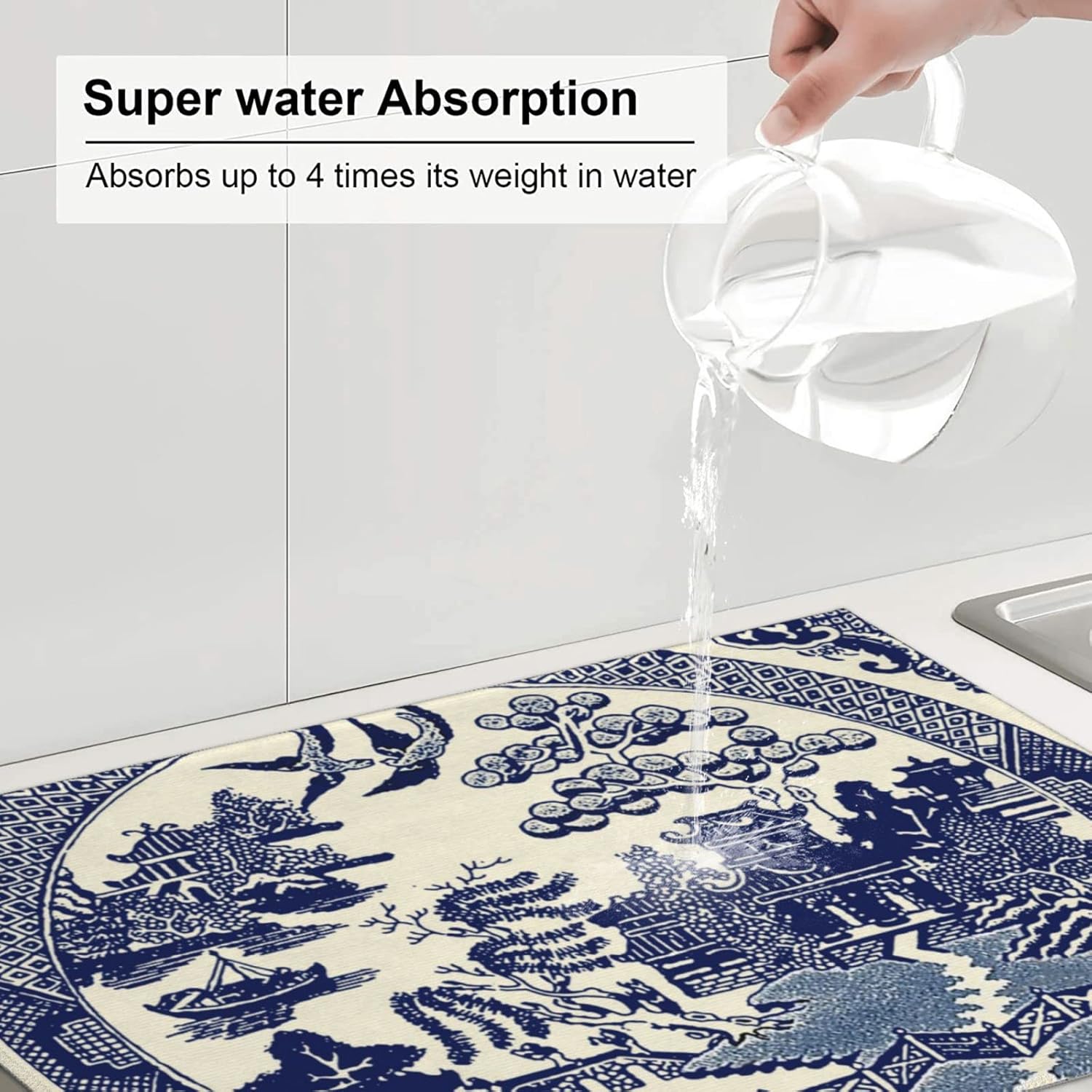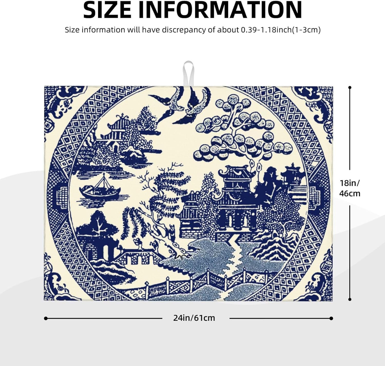 Dish Drying Mat For Kitchen Counter Absorbent Dish Mat Reversible Drainer Drying Kitchen Mat (Oriental Style Chinese Blue Willow, 24X18)
