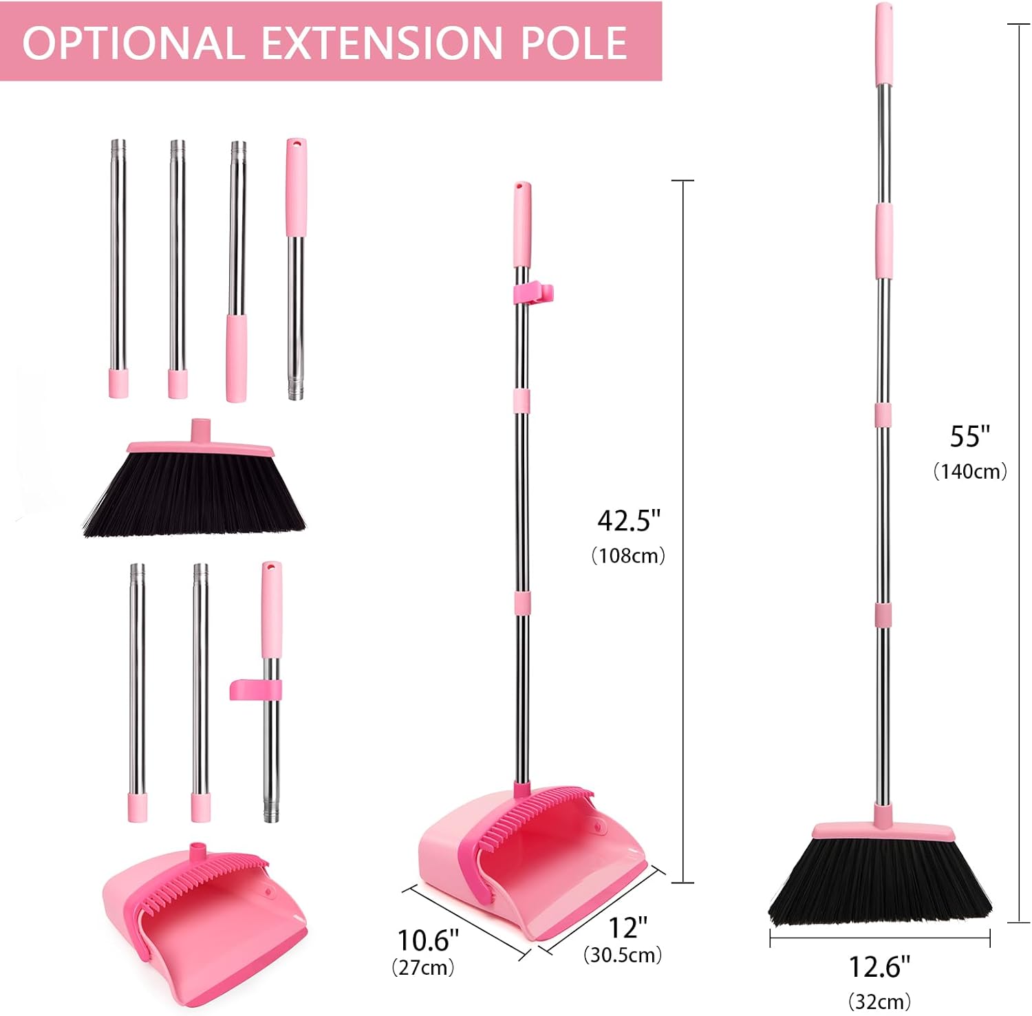 - 【STYLISH DESIGN】: The broom and dustpan set features an extended long handle and a large capacity dustpan, making it ideal for sweeping. The long handle enables you to stand upright and sweep comfortably without the need to bend down. Additionally, the set includes comb teeth that effectively remove residual hairs from the broom bristles, ensuring clean hands and protecting your back. Moreover, the set comes in a stylish color scheme, adding a touch of elegance to your daily cleaning routine.