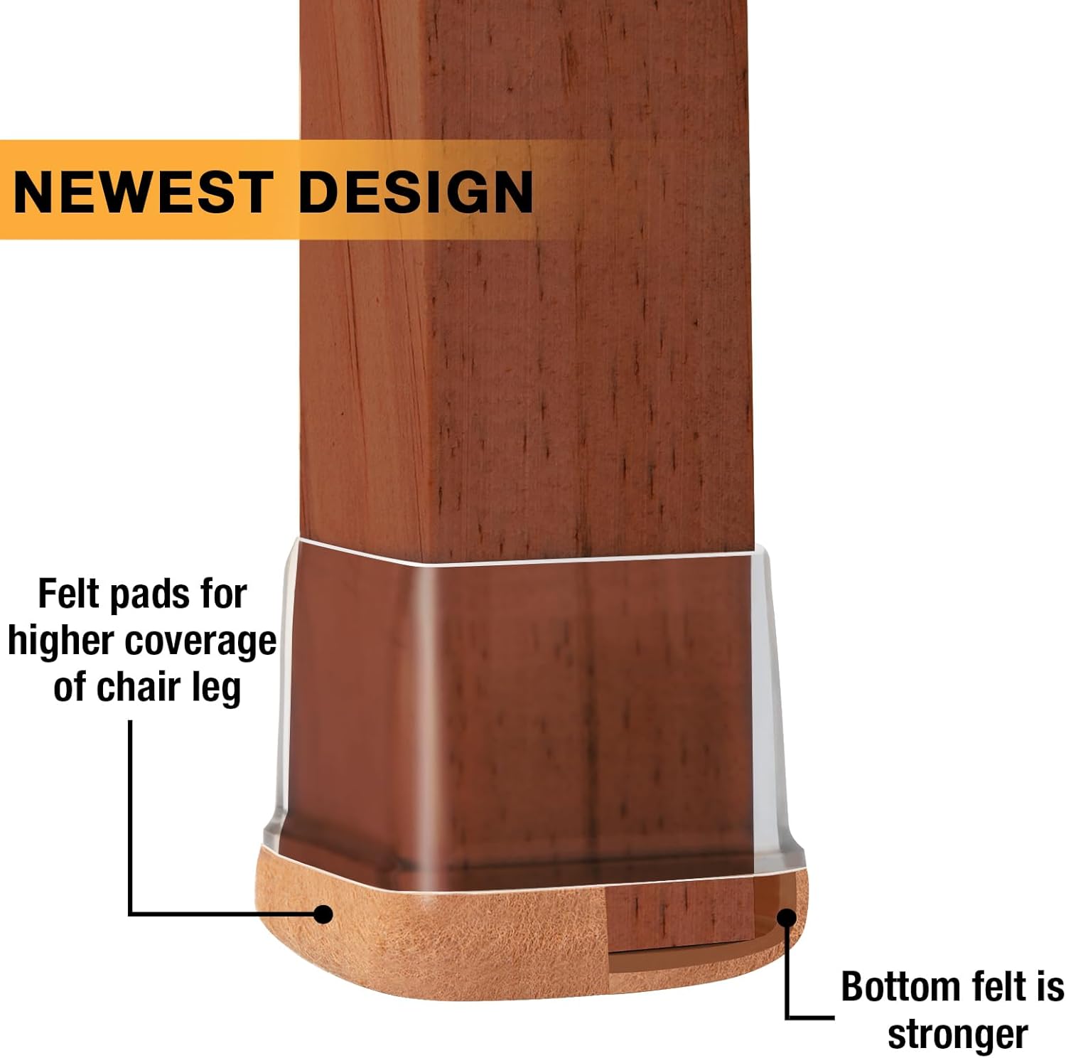 • 【Upgrade New Design】: 360° full felt pad bottom wrapped, which helps the felt bottom be able to touch the floor at any angle, preventing scratching the floor. Our chair leg floor protectors do not use gel. The bottom felt pad and the silicone chair leg floor protectors are integrated with a high-pressure machine to ensure that they will never fall off.