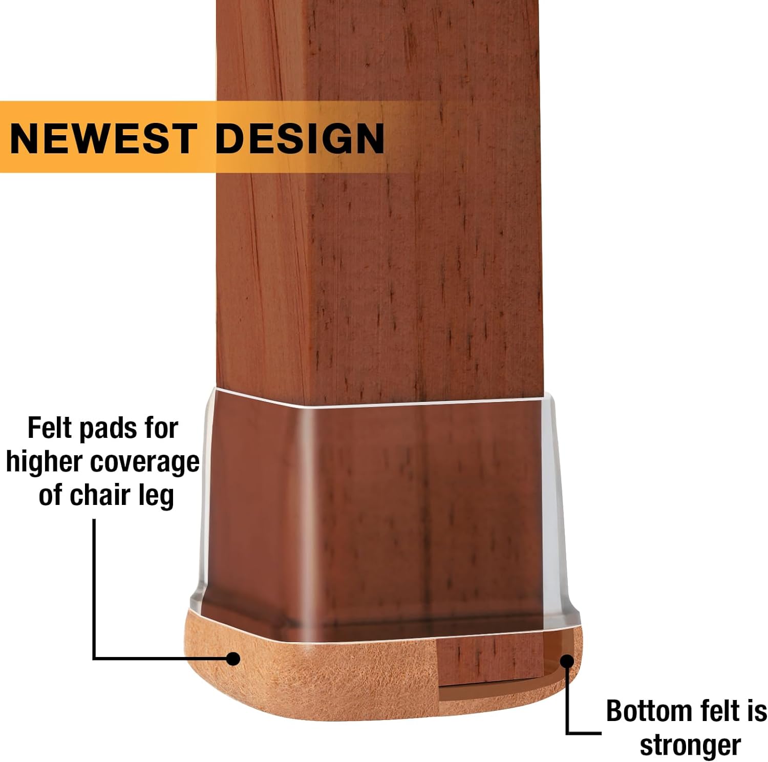 • 【Upgrade New Design】: 360° full felt pad bottom wrapped, which helps the felt bottom be able to touch the floor at any angle, preventing scratching the floor. Our chair leg floor protectors do not use gel. The bottom felt pad and the silicone chair leg floor protectors are integrated with a high-pressure machine to ensure that they will never fall off.