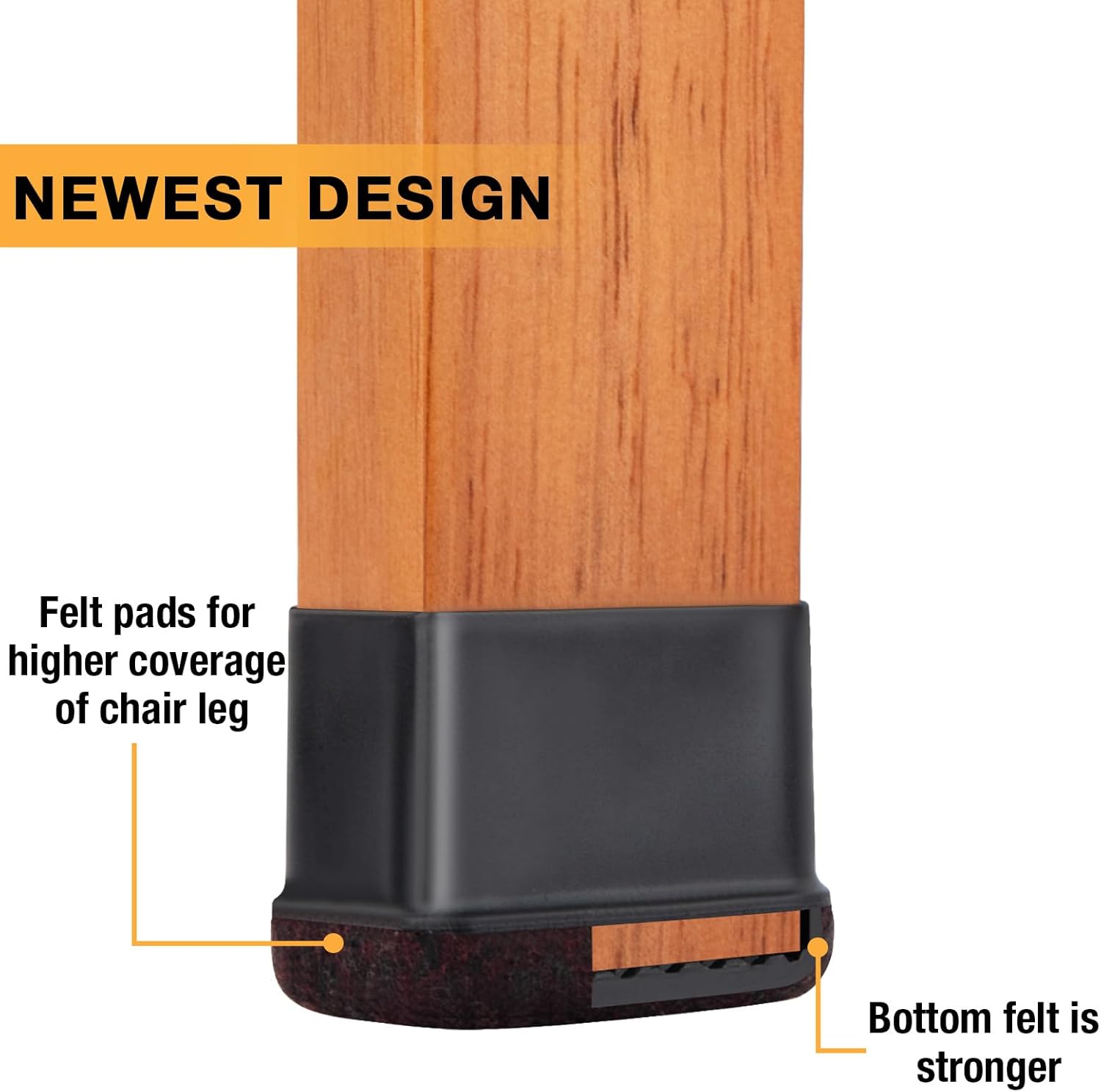 • 【Upgrade New Design】: 360° full felt pad bottom wrapped, which helps the felt bottom be able to touch the floor at any angle, preventing scratching the floor. Our chair leg floor protectors do not use gel. The bottom felt pad and the silicone chair leg floor protectors are integrated with a high-pressure machine to ensure that they will never fall off.