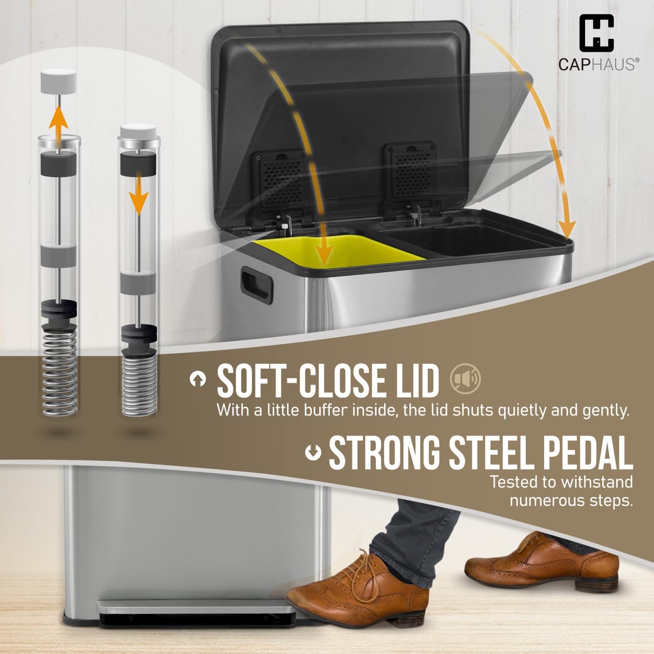 CAPHAUS Dual Trash Can with Lid, Trash and Recycling Bins Combo for Kitchen, Hands-Free Stainless-Steel Garbage Can with 2 Compartment, Hinged Lid, Odor Filter, Handles, 30L+30L, 2 x 8 Gallon