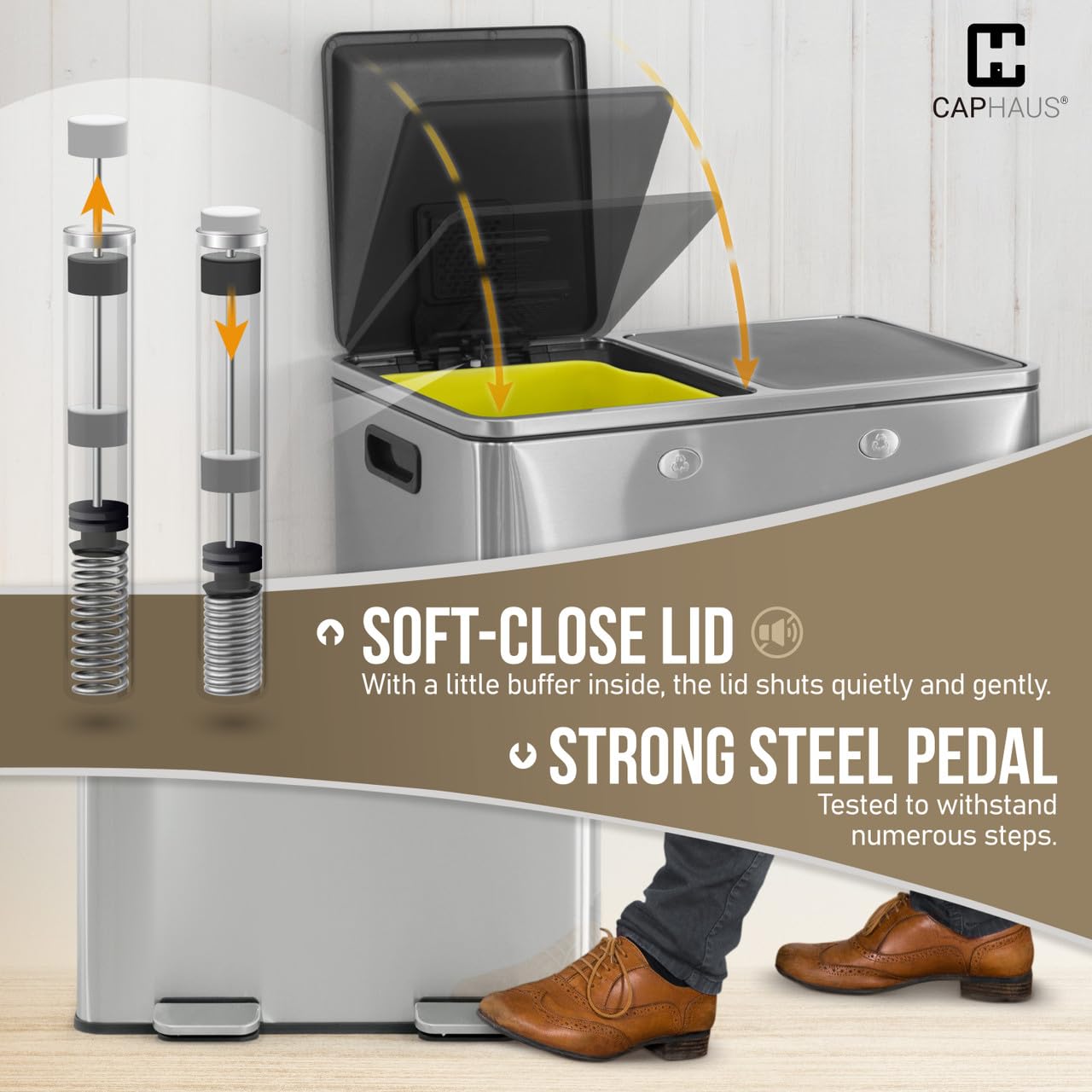 CAPHAUS Dual Trash Can with Double Lid, Trash and Recycle Bins Combo, Hands-Free Stainless-Steel Garbage Can for Kitchen, with 2 Compartment, Hinged Lid, Odor Filters, Handles, 30L+30L, 2 x 8 Gallon