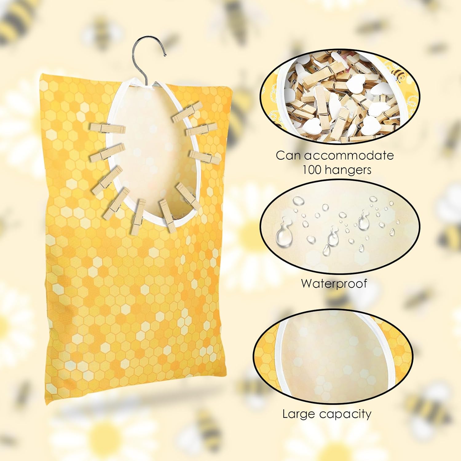 Bee Honeycomb Clothespin Holder - 2 Pcs Bee Clothes Pin Bags - 15 X 11 Inch - Clothes Hanging Bag for Laundry Room & Outdoor Use