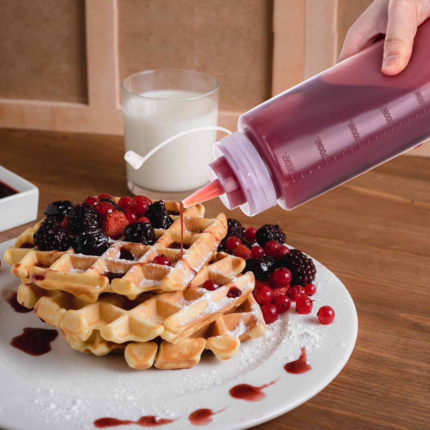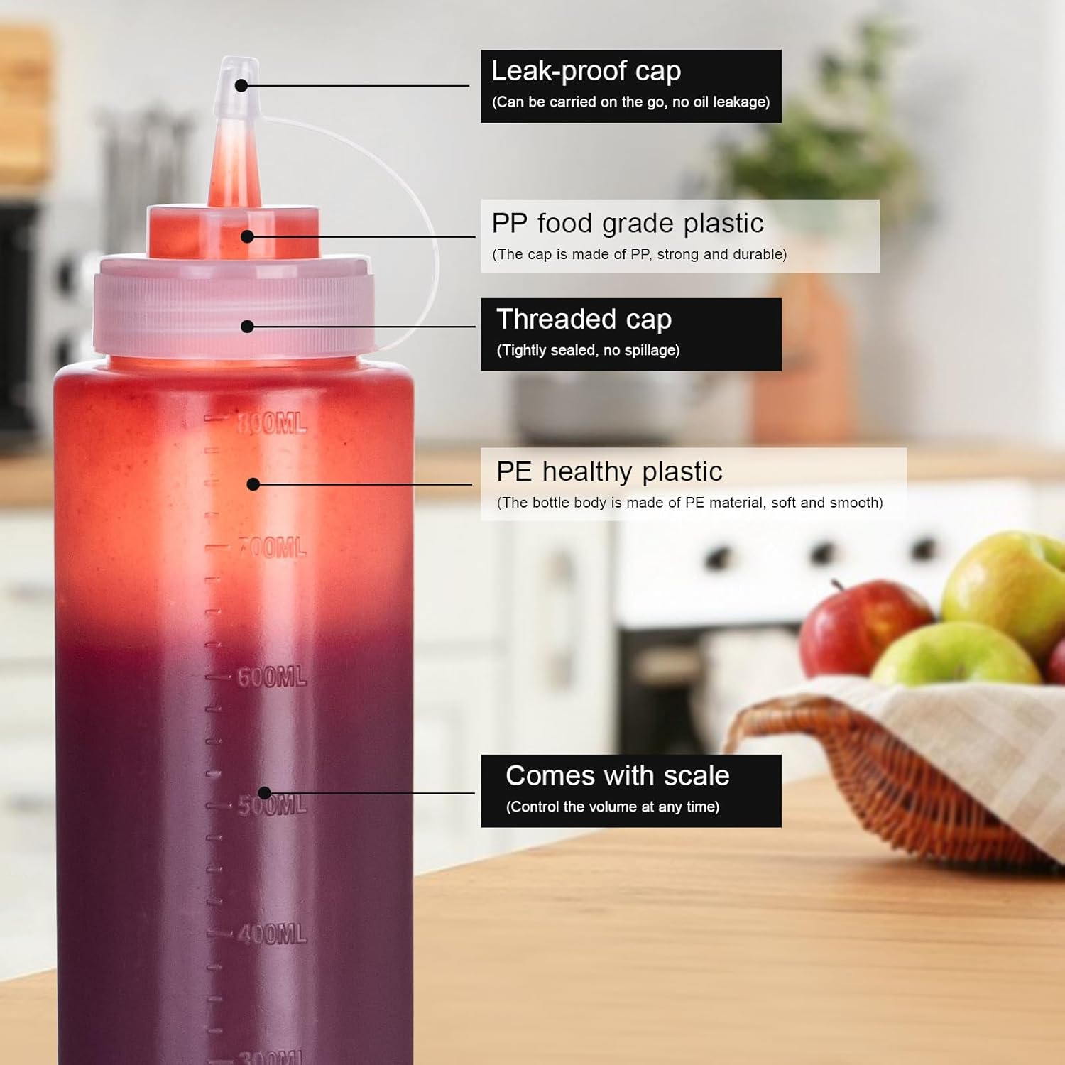• Direct Measurements - Condiment squeeze bottle has a standard 100ml - 800ml scale line. By translucence plastic condiment squeeze bottles, you can squeeze precisely and see the capacity.