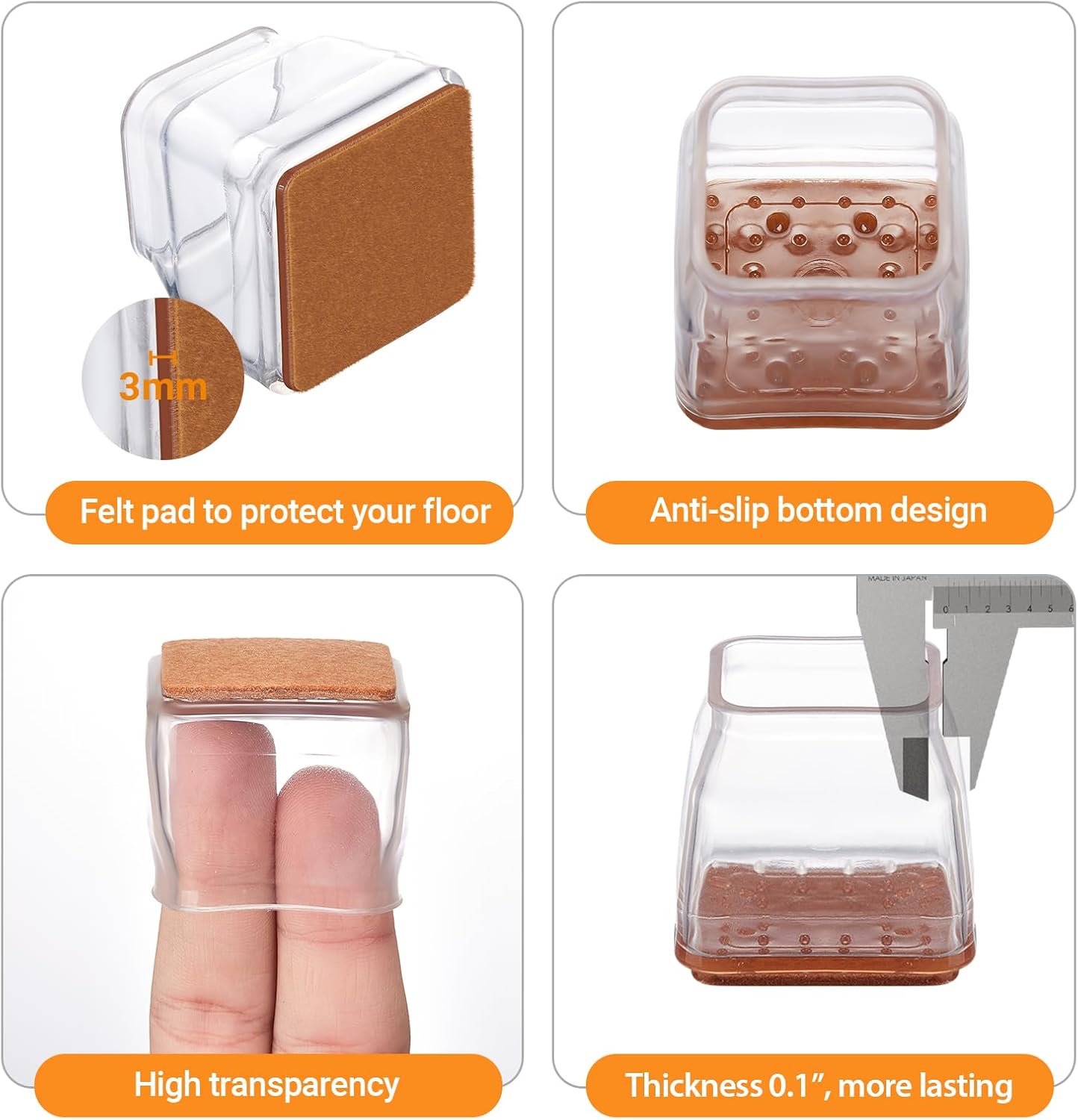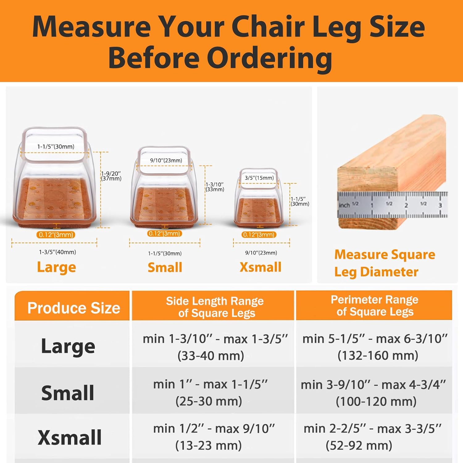 - APPLICABLE SHAPES AND SIZES: Our chair leg floor protectors only fit wooden square chair legs. Compared with the round chair leg caps, the square chair leg floor protector fits the square chair leg better. We have tow sizes chair leg protectors for hardwood floors.Please measure the size of your furniture feet before buying.The S size chair leg floor protectors square is suitable for square leg with side length 1/2" to 9/10"(13-23mm), irregular leg with perimeter 2-2/5" to 3-3/5" (52-92mm).