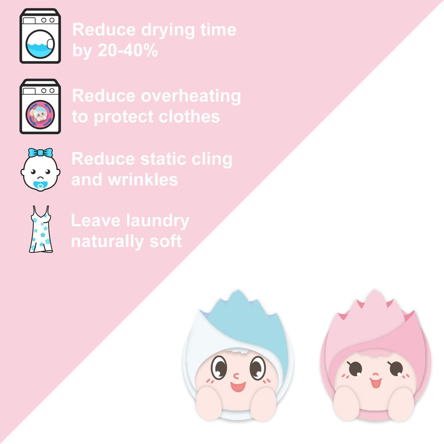 • INNOVATIVE HANDCRAFT technology to reduce the sticky wool when drying, solve the problem of most of the similar products.By increasing air circulation and dispersing the contact area between fabrics, they absorb moisture faster, allowing laundry to dry more quickly.