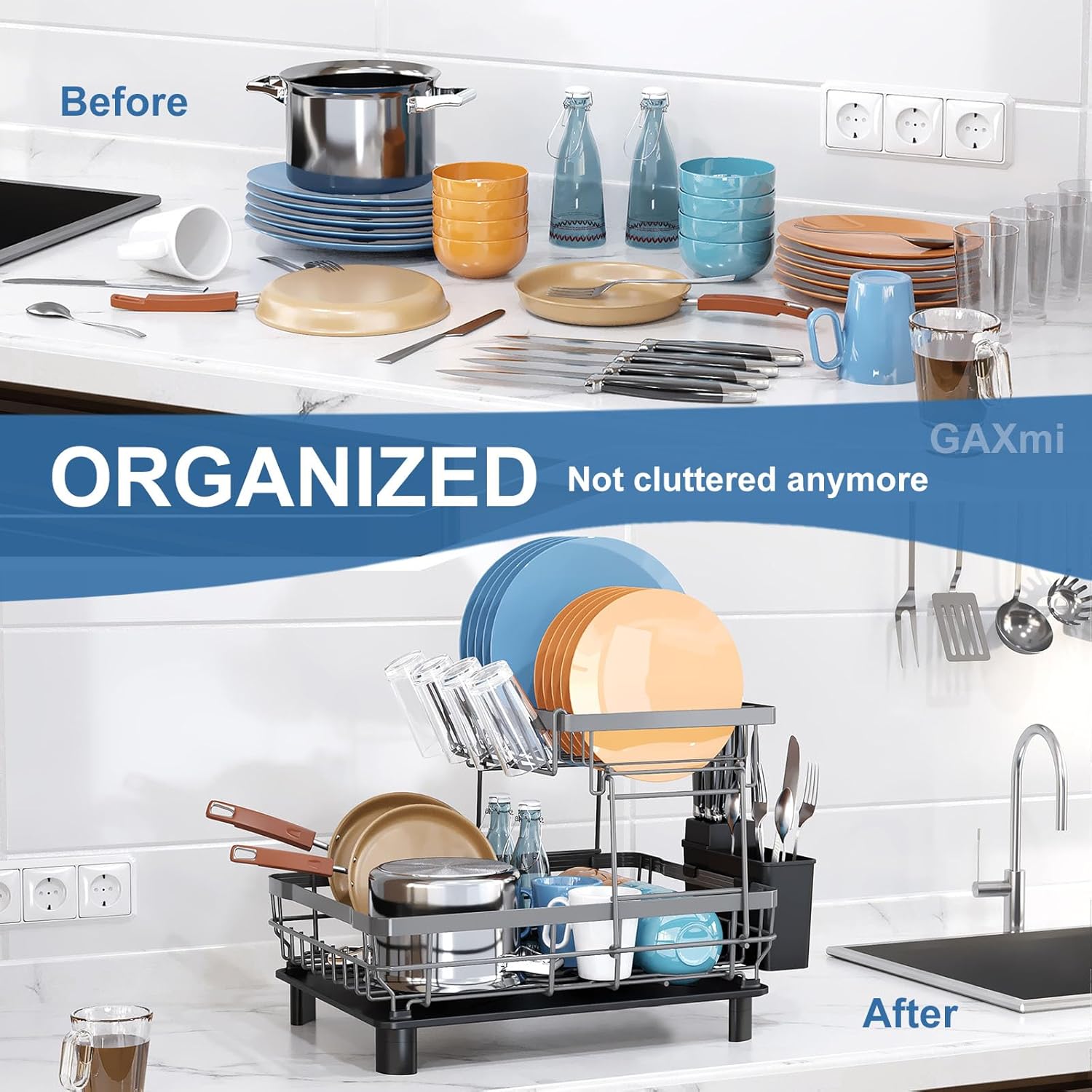 GAXmi Dish Drying Rack Over The Sink Dish Drainer with Drainboard Utensil Holder Cup Holder, 2-Tier Grey
