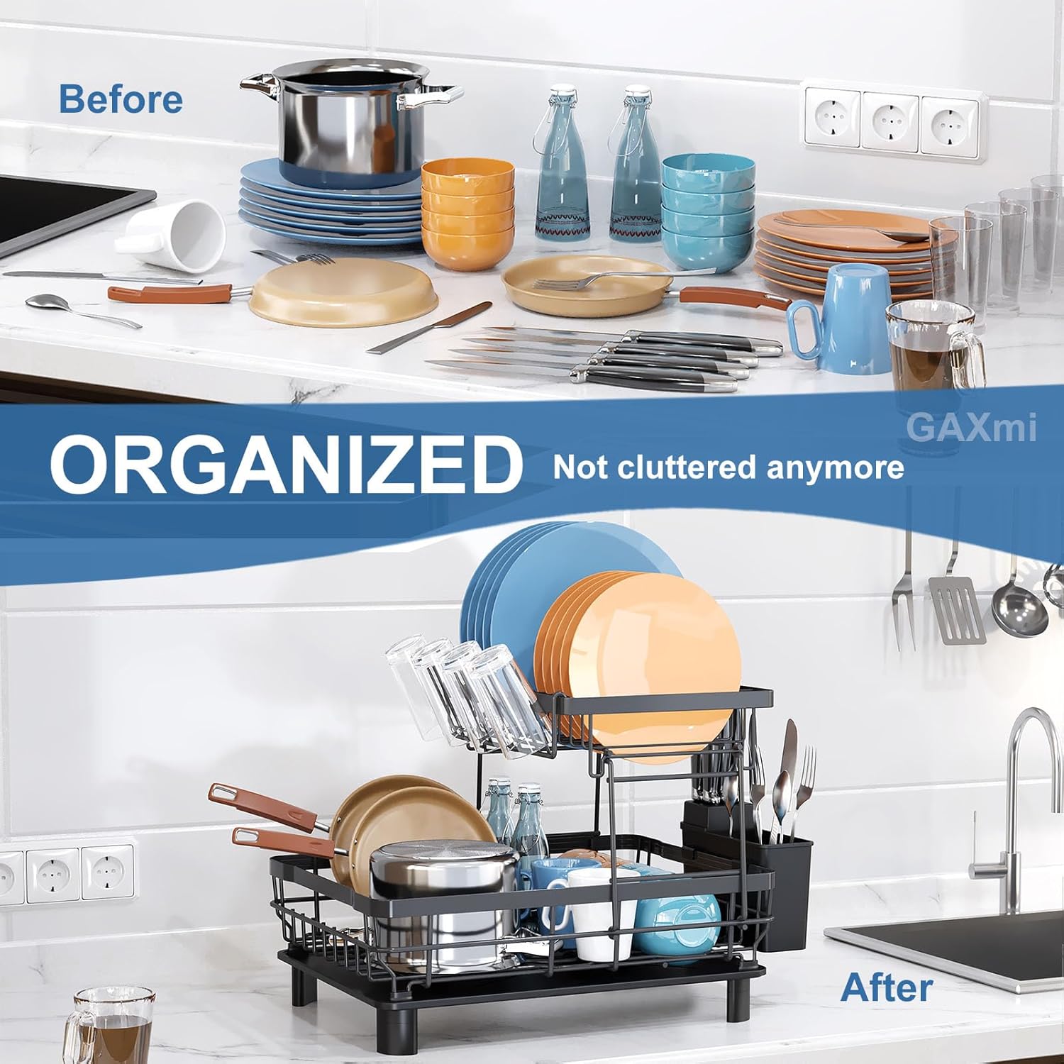 • Space-Saving: this dish drying rack is able to organize one meal tableware. Your kitchen countertop will not be scattered anymore.