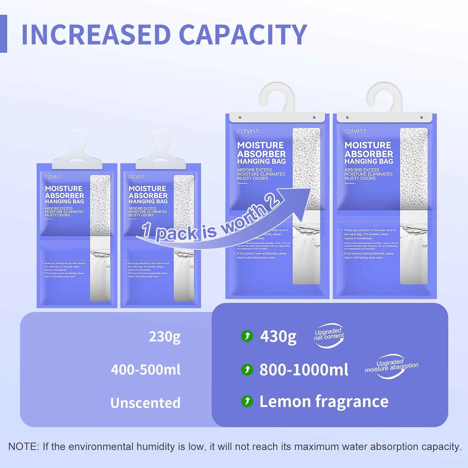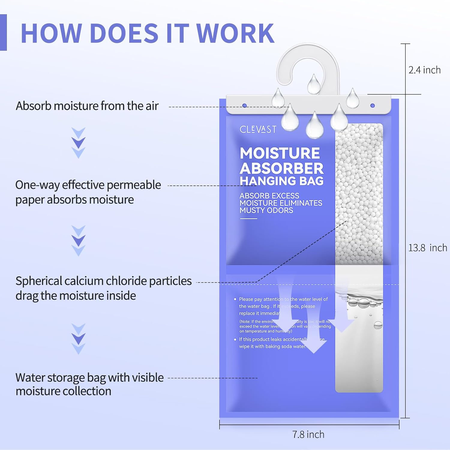 - VISIBLE DEHUMIDIFYING PROCESS: The CLEVAST absorber bags capture excess moisture in the air and trap it to a large 1000ml water storage. The accumulated water through the dehumidification effect can be monitored anytime. Dehumidifier bags can be used for up to 110 days (NOTE: If the environmental humidity is low, it will not exceed the 1000ml water level. Duration will vary depending on temperature and humidity).