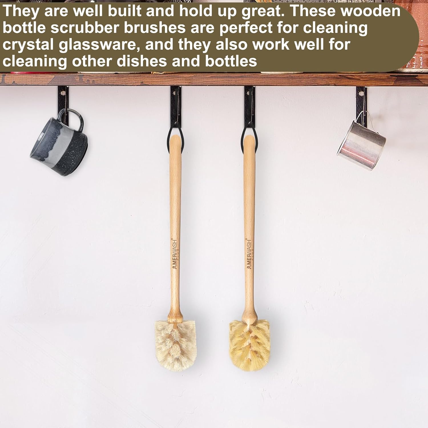 Bottle Brushes with Natural Bristles, 13-3/4 Inch Long Wood Handle Bottle Brush Cleans and Scrubs Wide Mouth Jars, Glasses, Vases, Mugs and Pitchers, Sisal + Horsehair Bristles 2 Pack