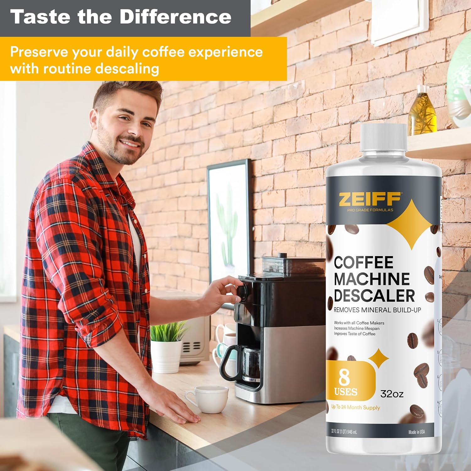 - 8 Use Value Bottle –– Packed with up to 24 months of cleaning power in one 32-ounce bottle, less waste, better value! Made in USA, the citric acid coffee descaling solution is odorless, safe and simple to use. Just 4 ounces of descaler solution per cleaning tackles stubborn mineral buildup, limescale, and calcium deposits to enhance the longevity and efficiency of your machine. Descale every 2-3 months for optimal performance
