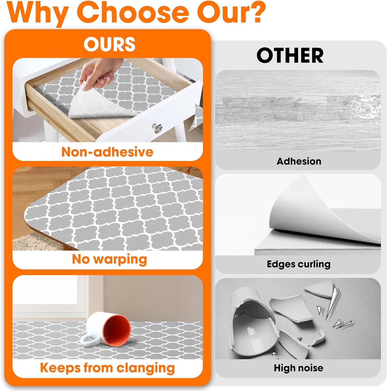 - Kitchen Drawer Liner【Easy to Use】: Enjoy a carefree space with our versatile kitchen shelf liner! Get creative and customize to fit your shelves and drawers. Non-adhesive design can be reused many times to avoid the damage caused by glue to the surface