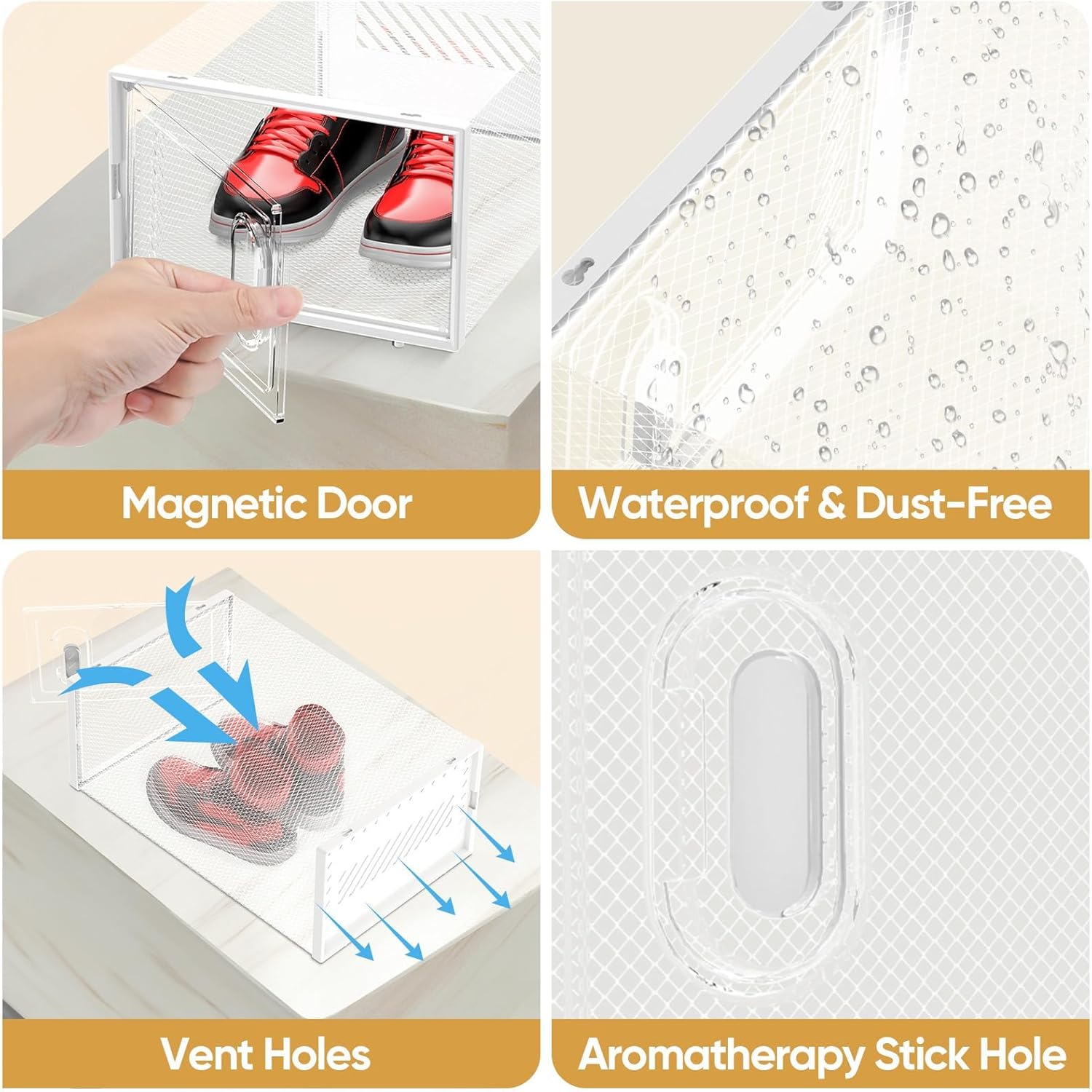 • [UPGRADE VERSION] Larger Space + Magnetic Door + Ventilation Holes + Aromatherapy Stick Hole + Thickened Material. This shoe box offers ample space for your shoes, along with a designated slot for an aromatherapy stick(not included). The door's magnetic closure provides a secure seal to prevent accidental opening.
