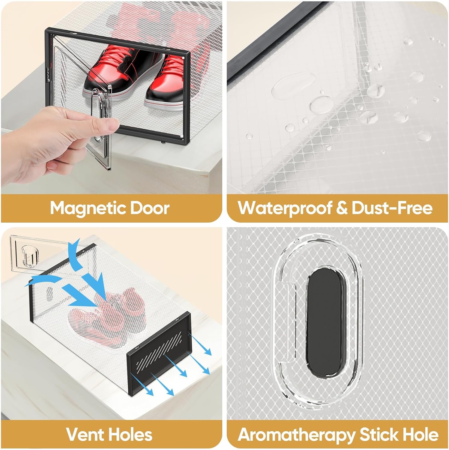 • [UPGRADE VERSION] Larger Space + Magnetic Door + Ventilation Holes + Aromatherapy Stick Hole + Thickened Material. This shoe box offers ample space for your shoes, along with a designated slot for an aromatherapy stick(not included). The door's magnetic closure provides a secure seal to prevent accidental opening.