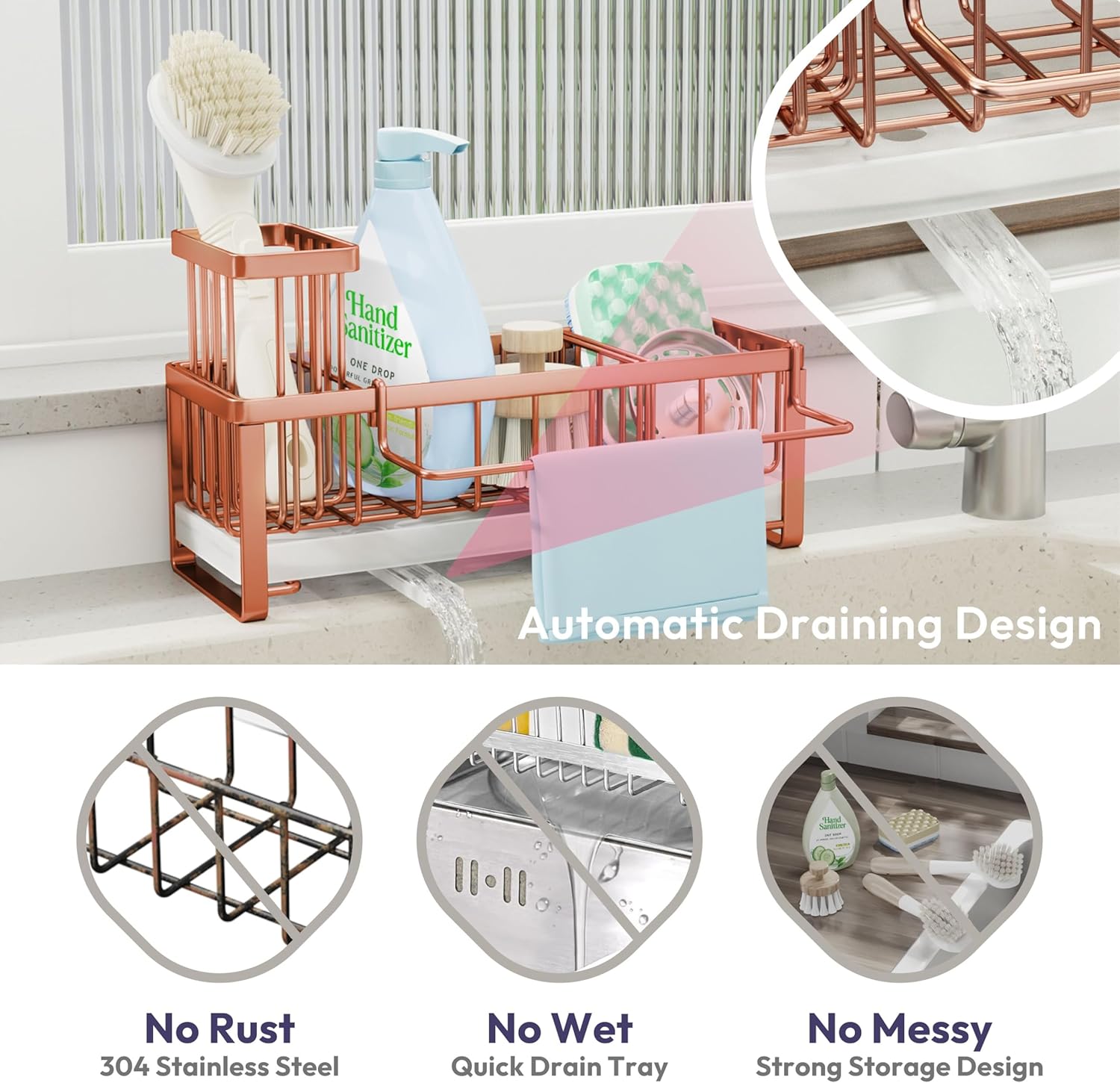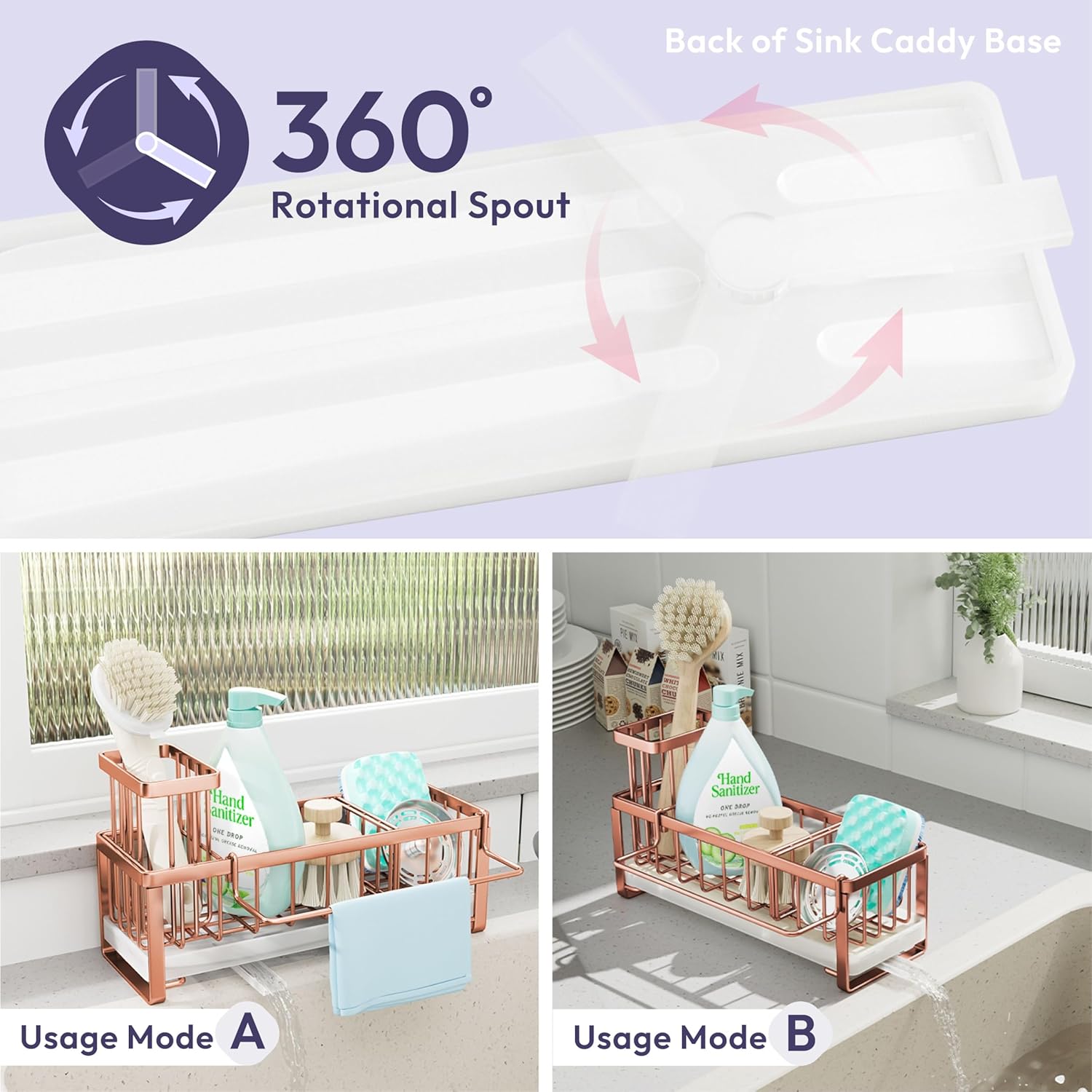 - [Automatic Draining]: Are you tired of cleaning the countertop?SWTYMIKI sponge holder for kitchen sink with 360° rotatable draining pipe can help you! Just put the sink caddy next to the sink, the water will drain automatically into the sink
