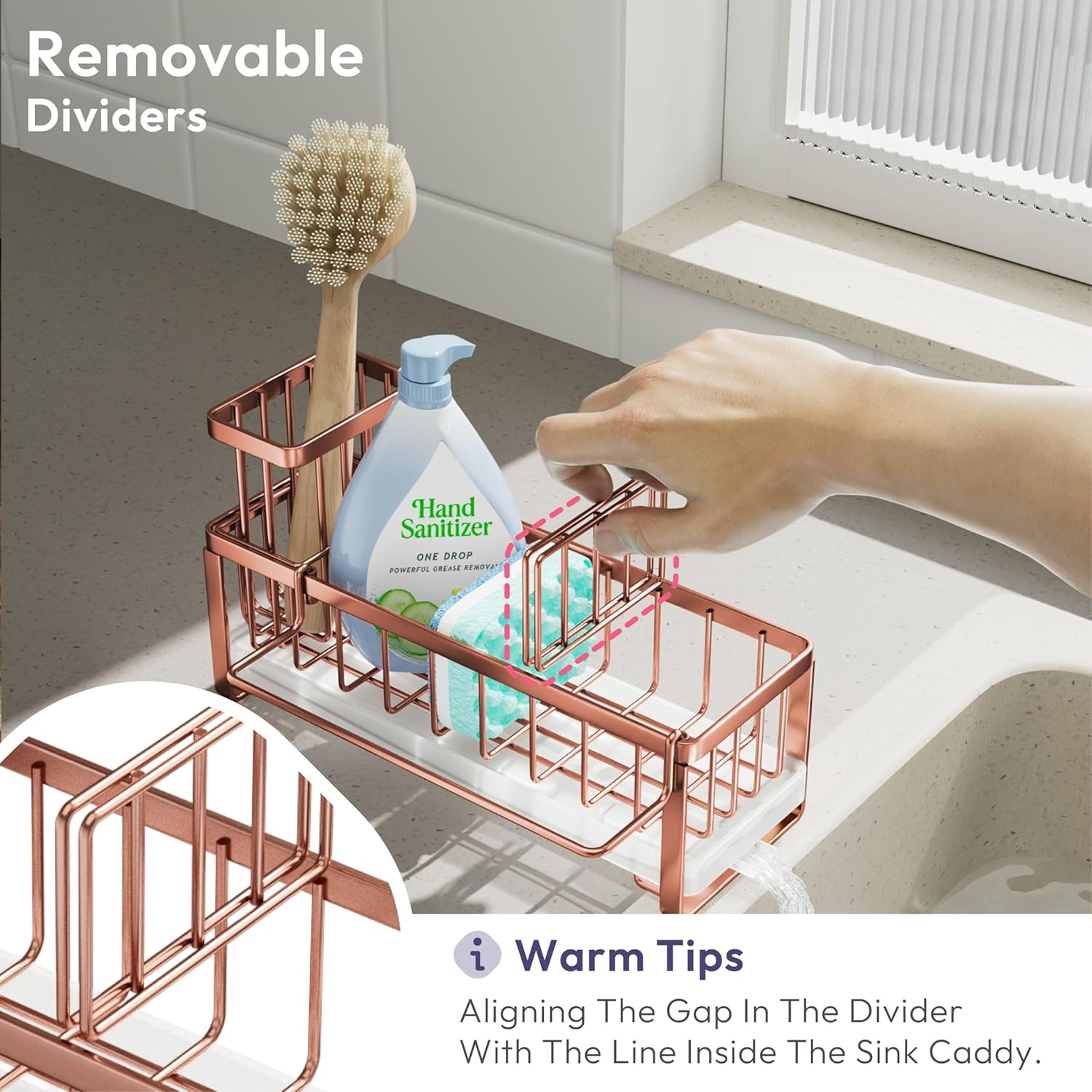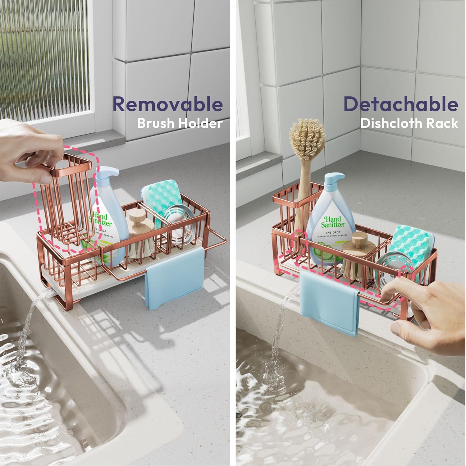 - [Unique Divided Space Sponge Caddy]: The removable baffle design divides the sink caddy into 2 separate storage spaces, you can disassemble at any time according to your need, it's perfect for storing dish soap bottles, sponges, sink stoppers,etc