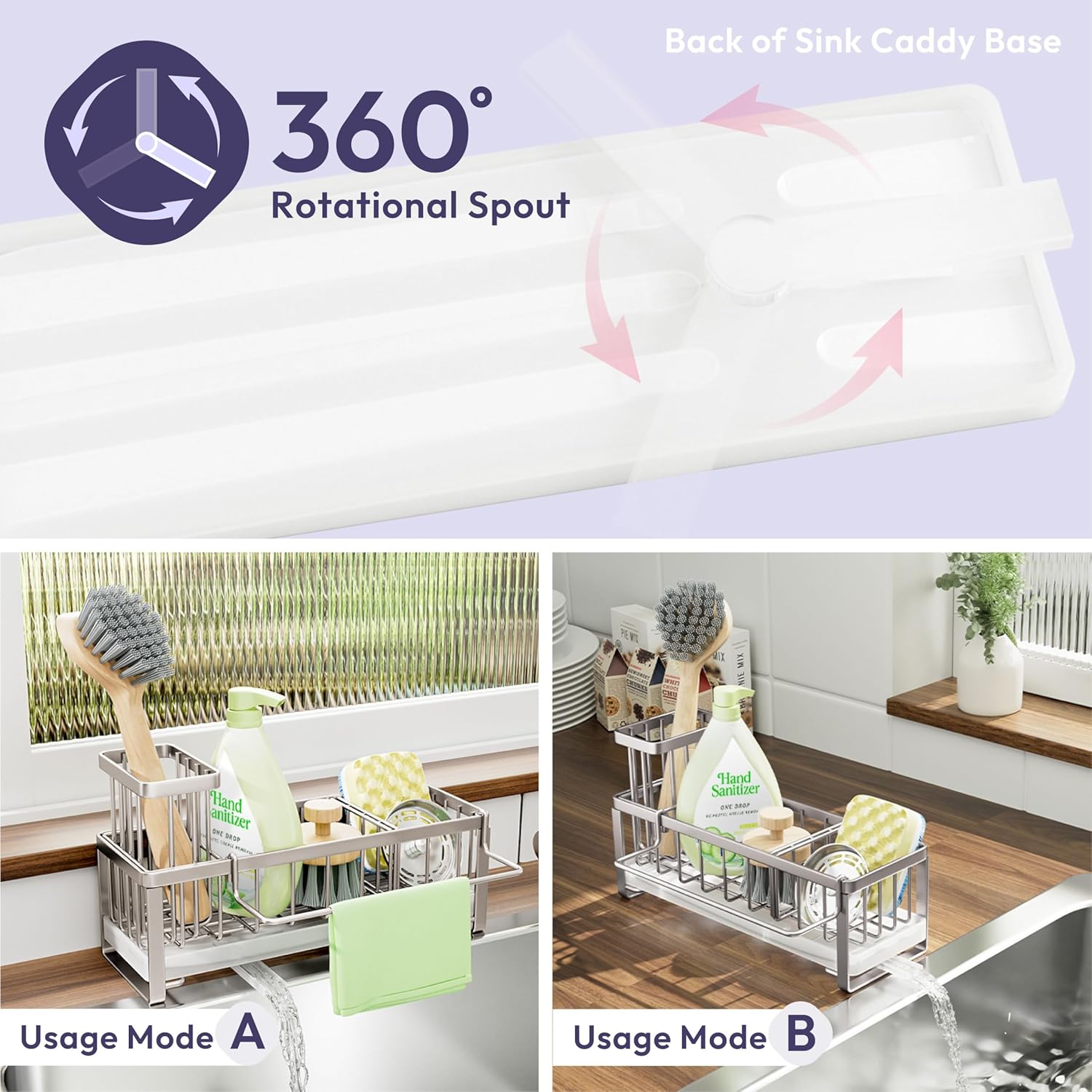 - [Automatic Draining]: Are you tired of cleaning the countertop?SWTYMIKI sponge holder for kitchen sink with 360° rotatable draining pipe can help you! Just put the sink caddy next to the sink, the water will drain automatically into the sink