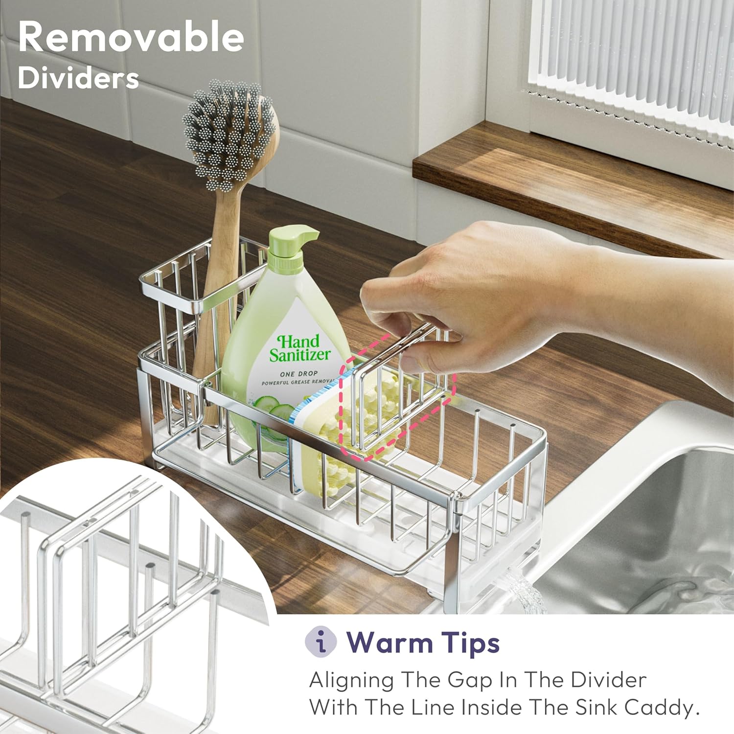 - [Unique Divided Space Sponge Caddy]: The removable baffle design divides the sink caddy into 2 separate storage spaces, you can disassemble at any time according to your need, it's perfect for storing dish soap bottles, sponges, sink stoppers,etc