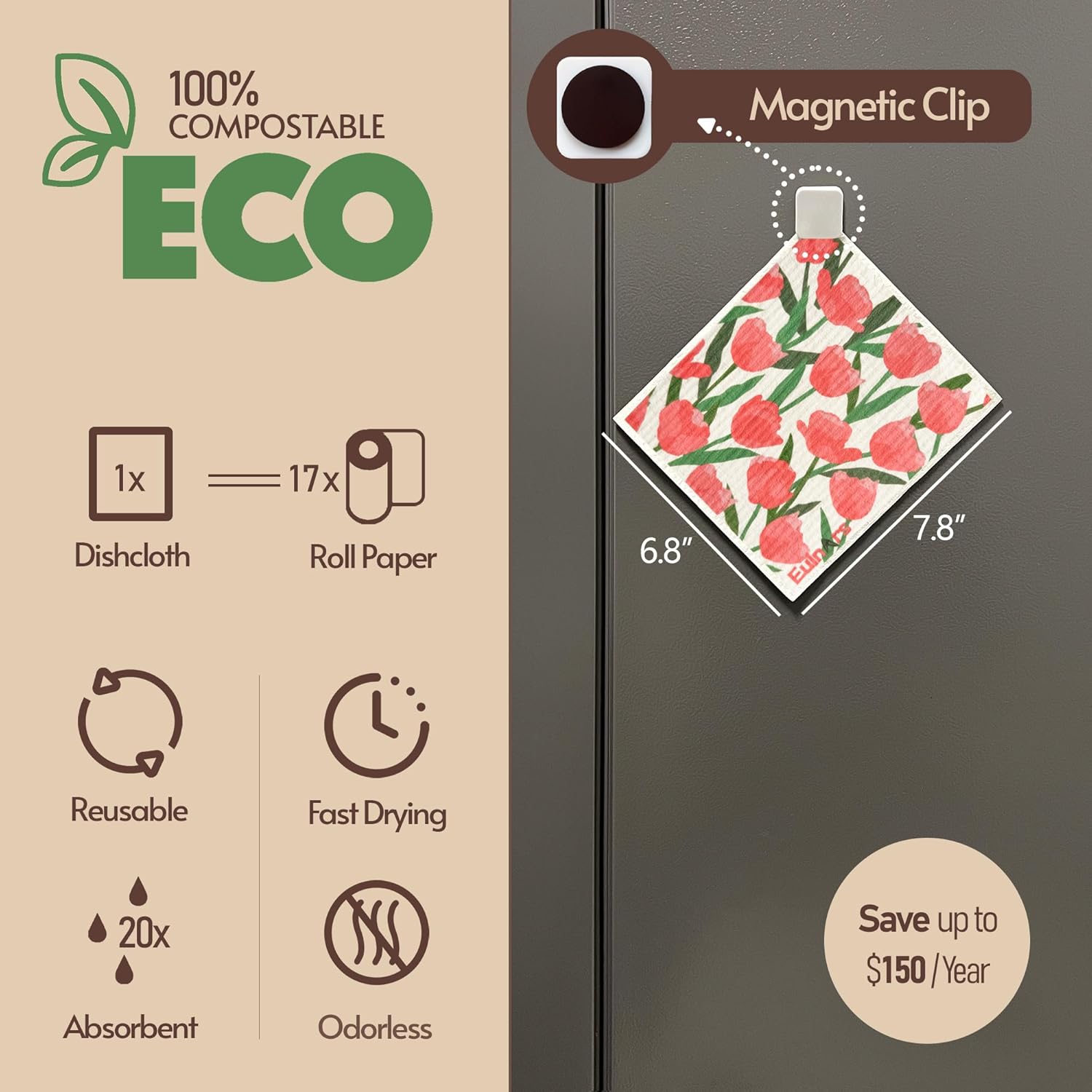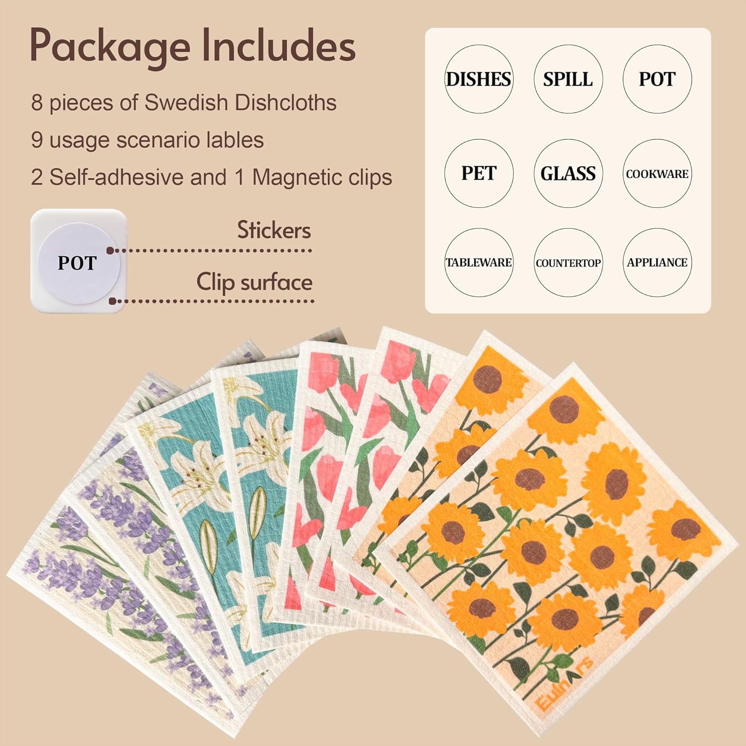 • Easy to Clean and Store: Our swedish dish cloths, measuring 7.8 x 6.8 inches, each set comes with 8 cellulose dish cloths in 4 styles, along with 2 self-adhesive clips, 1 magnetic clip, and 9 labeling tags. Customize storage for easy access, hanging them on walls, counters, or refrigerators to keep your kitchen organized