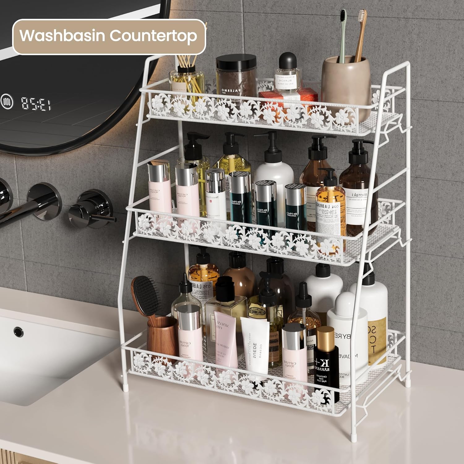 • iBedmazie 3-Tier Storage Racks Countertop Organizer,Large size Counter Spice Racks for Bathroom/Kitchen/Sink/Bedroom/Living room/Office/Coffee Station/Plant Rack with Two Metal Baskets