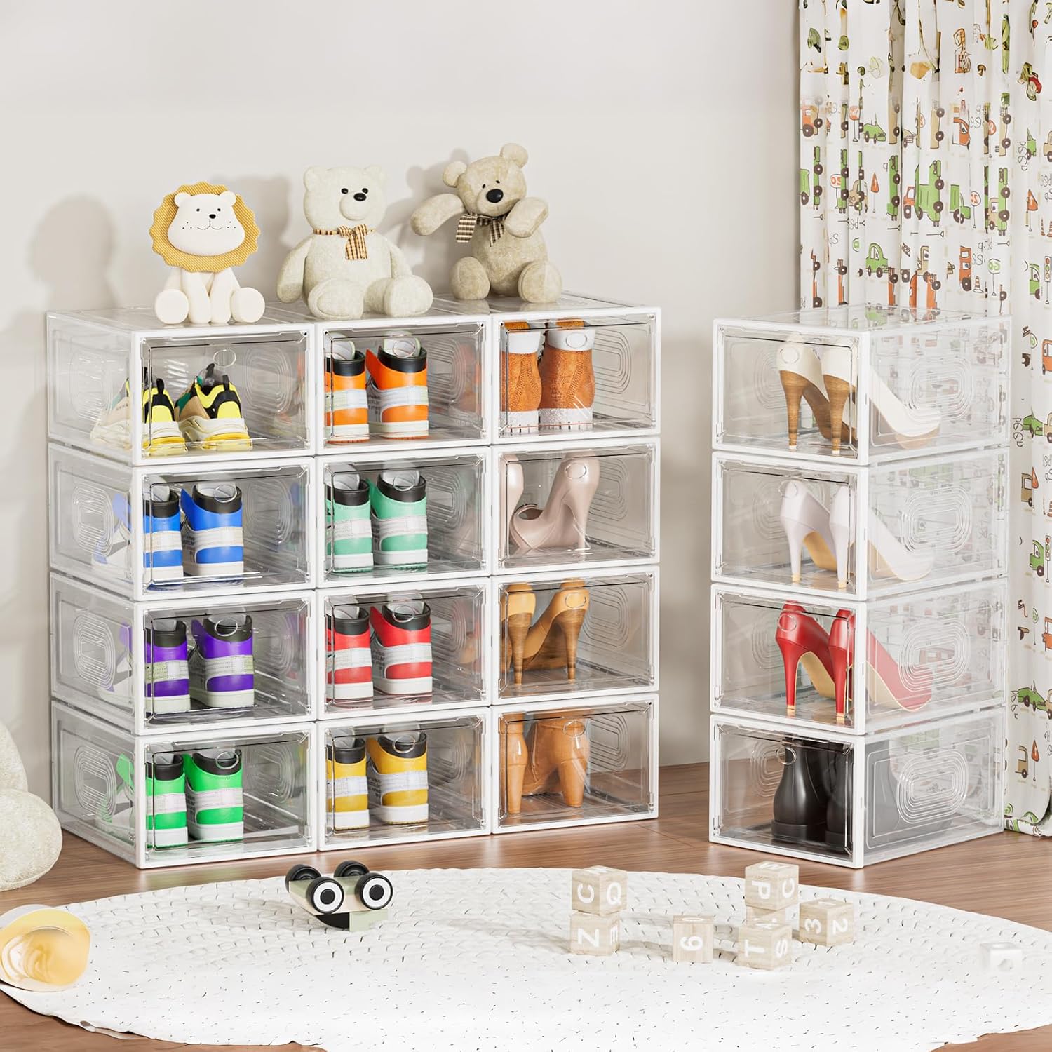 • 【Clear Shoe Box Stackable】Clear magnetic front door, stackable design, harder material, the shoe storage organizer provide you a more load-bearing multiple layers of shoe walls.You can find out the shoes with a glance over the boxes without open the boxes